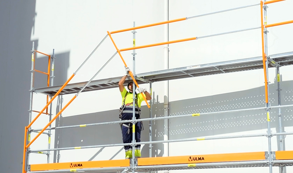 - Barandilla de montaje para protección colectiva. Montaje desde nivel inferior y protección de caídas al acceder al nivel superior. Pie de seguridad verificado según norma EN795 (protección contra caída en dispositivos de anclaje)