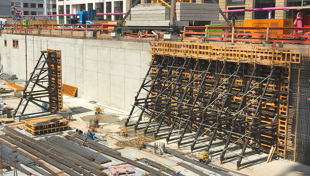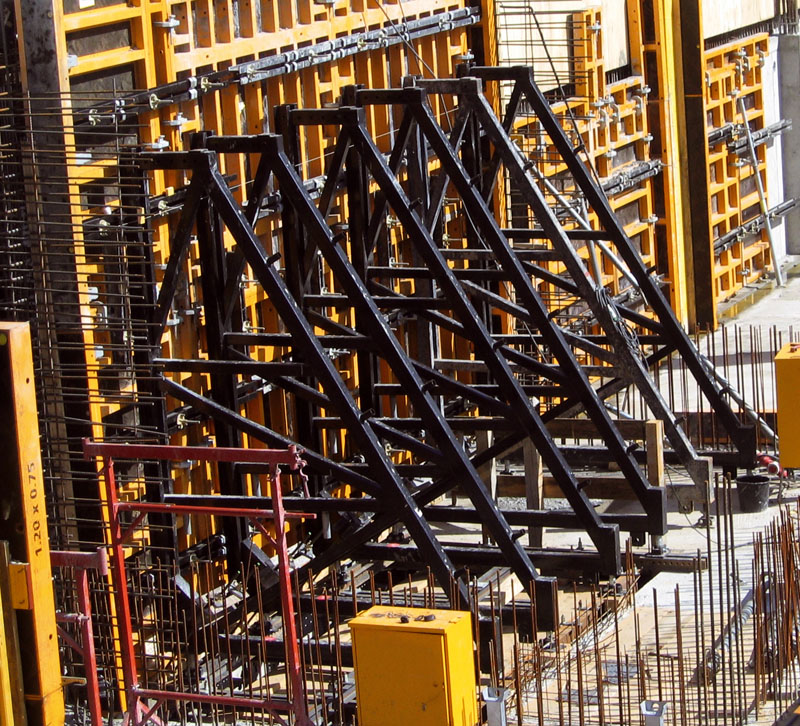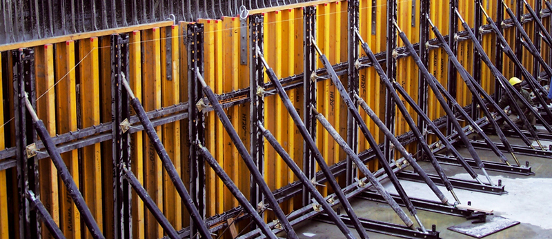 - Amarre a los paneles rápido y sencillo con cabezales. Fijación a la base con anclajes perdidos en el suelo de concreto previamente construido. La presión del concreto se transfiere a esos anclajes y por apoyo de las estructuras en el suelo