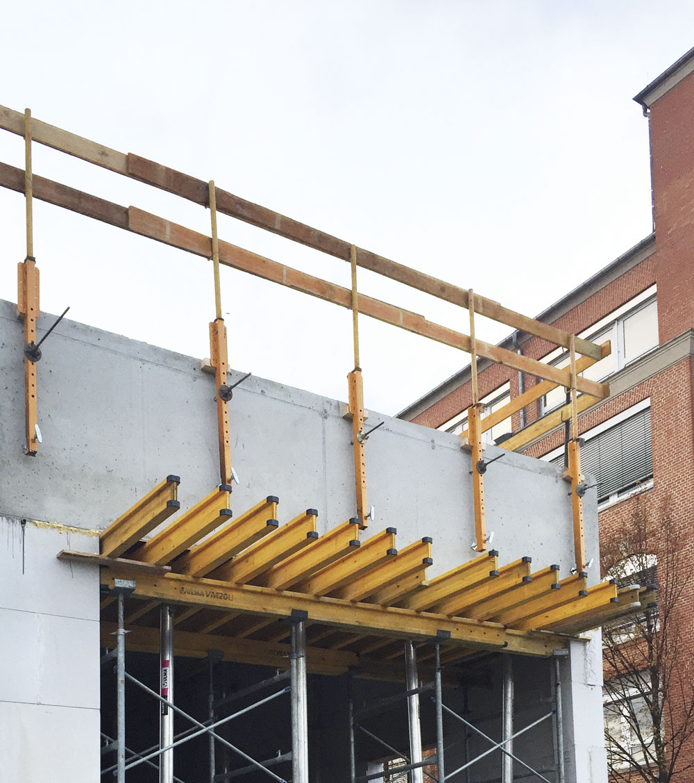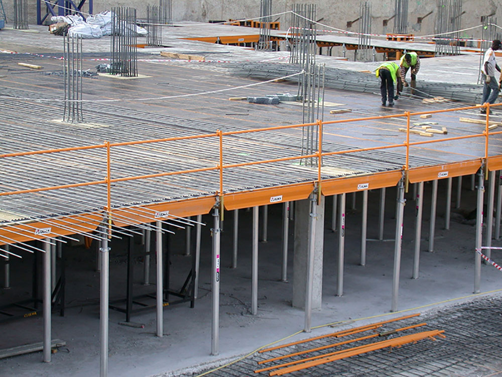 Barandillas de seguridad diseñadas para garantizar la protección colectiva en los bordes de forjado, de montaje sencillo y rápido. Optimizadas para su aplicación en superficies horizontales o inclinadas, se combinan con las cimbras para losas de ULMA pudiendo proteger hasta los bordes de forjado más complicados del edificio.