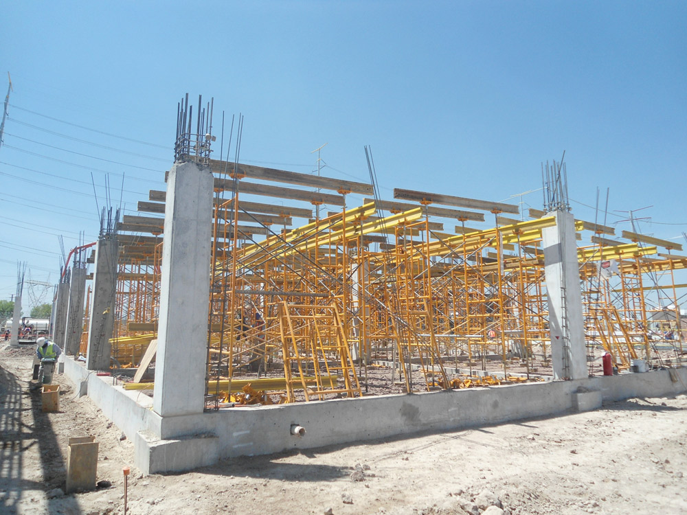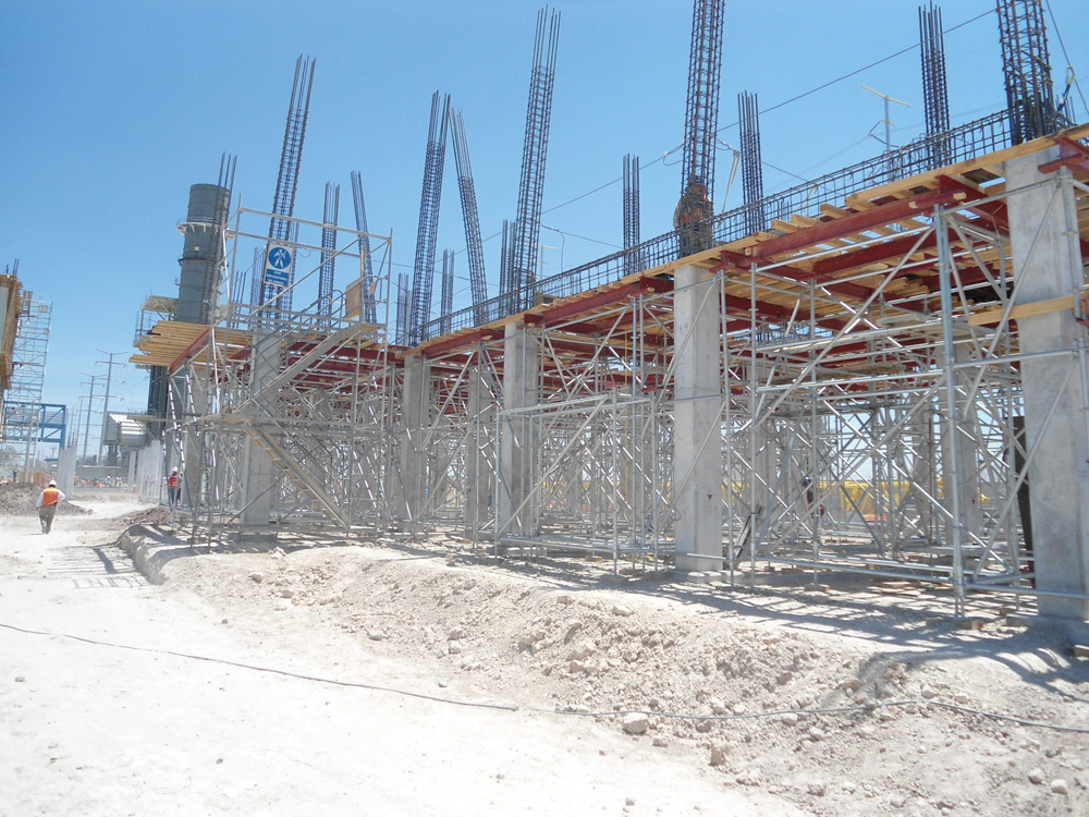 Se utilizan torres de Cimbra G como sistema de apuntalamiento y trabes VM20 como trabes de primera tramada, la segunda tramada fue por cuenta de obra. La obra solicitó completo apoyo de la trabe de primera tramada sobre el cabezal por lo que se implementó una solución especial mediante Cabezales Doble Entrada VM-DU, un casquillo metálico y tornillería de alta resistencia al corte para generar un cabezal especial orientable que pudiera ser acoplado directamente al husillo. Este cabezal permitió el completo apoyo de la trabe de primera tramada disminuyendo considerablemente la excentricidad que se genera con la solución convencional en losas inclinadas.