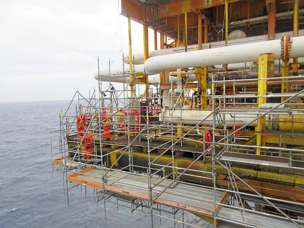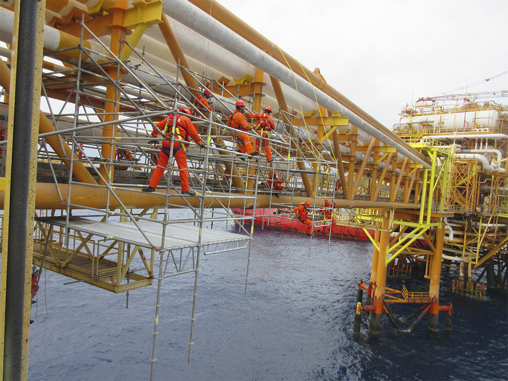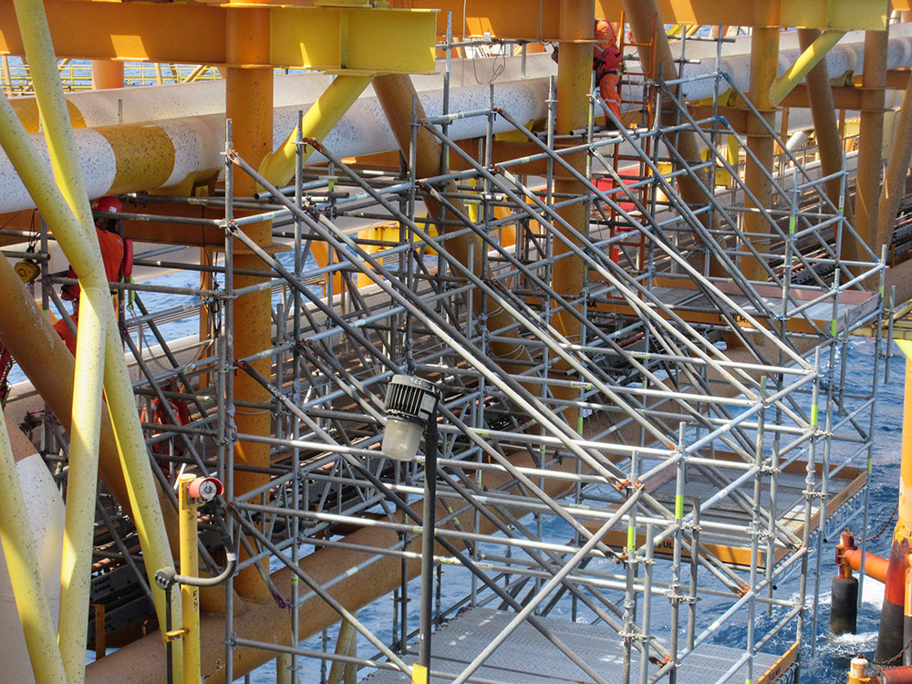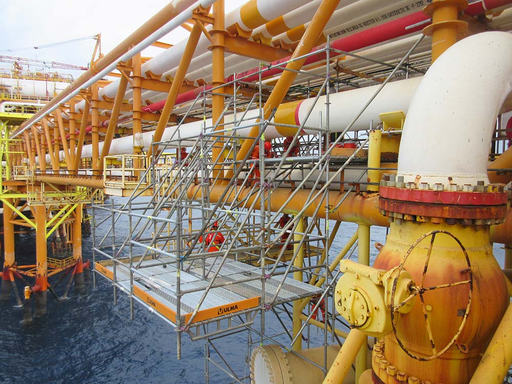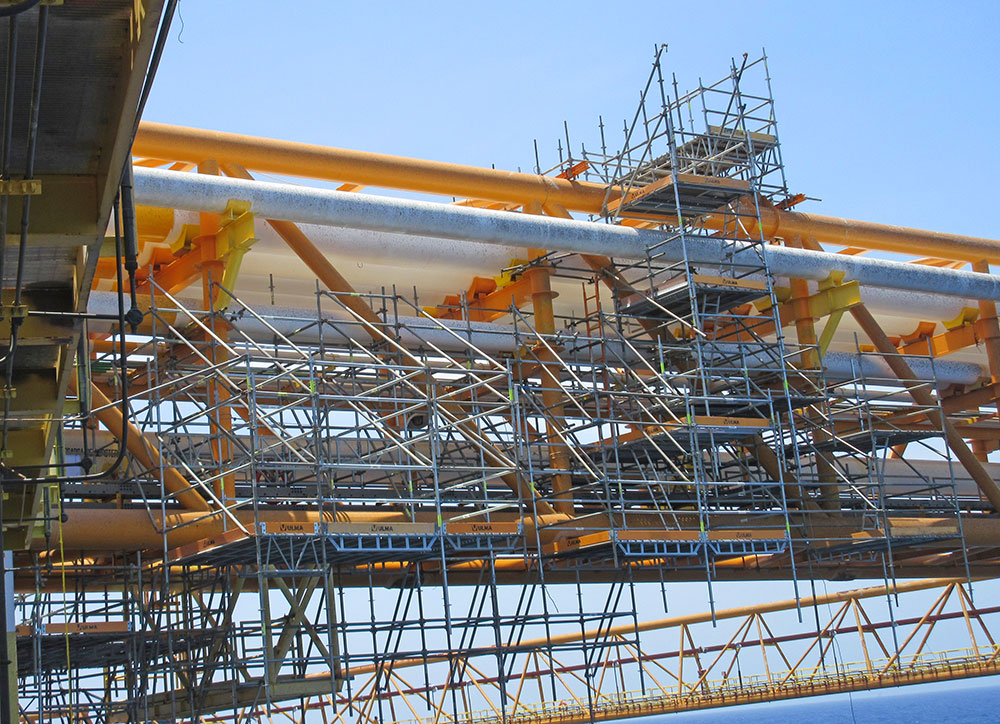 Los proyectos costa afuera conllevan riesgos que exceden a los de los proyectos de acceso estándar. El contratista Dragados Offshore requería un plan de acceso seguro para recubrir, soldar e inspeccionar la plataforma petrolera en sus diferentes frentes de trabajo. El andamio multidireccional BRIO fue la opción óptima para el proyecto. El espacio bajo de la plataforma petrolera era limitado, pero las plataformas con trampilla BRIO permitieron el acceso seguro y fácil a las zonas de trabajo.