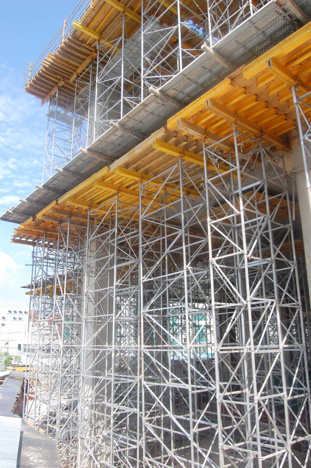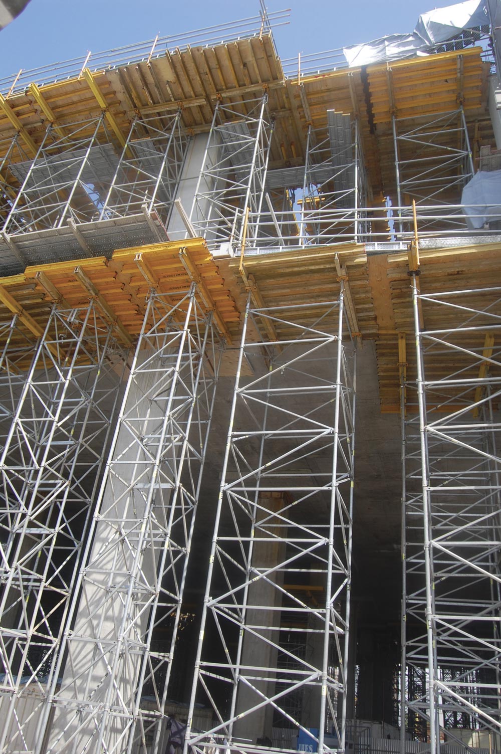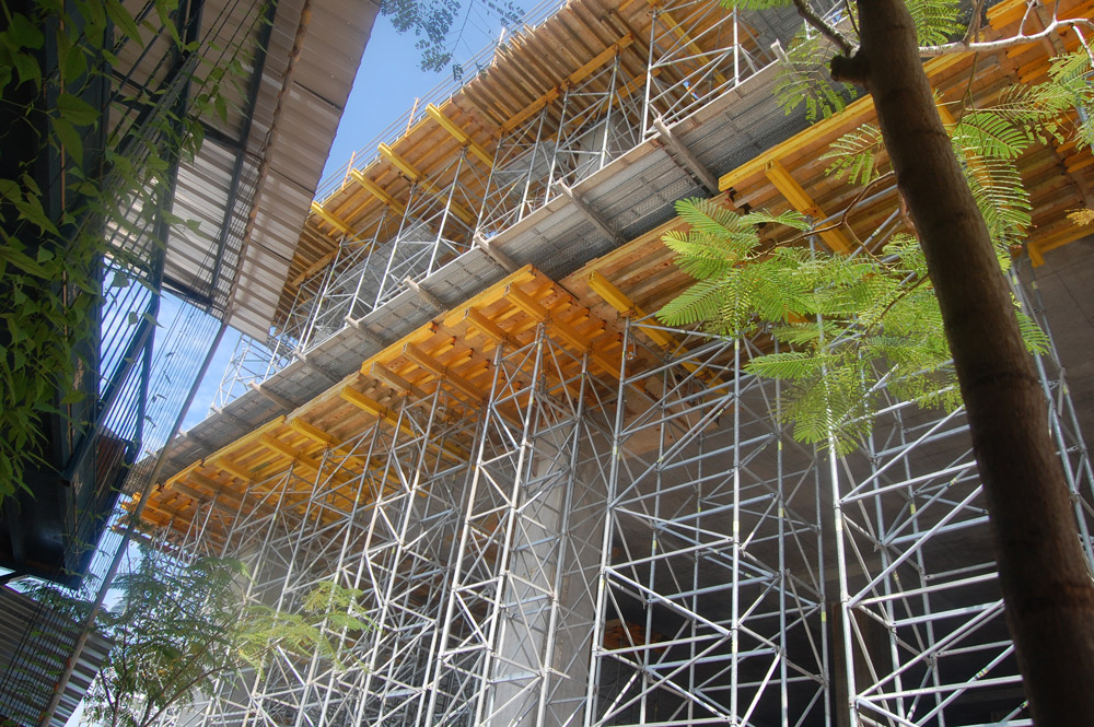 Losas y los capiteles de 750 mm se ejecutaron con Mesas VR. La gran altura requirió del apuntalamiento con Cimbra T-60 en diferentes modulaciones (1 m, 1.5 y 2 m).