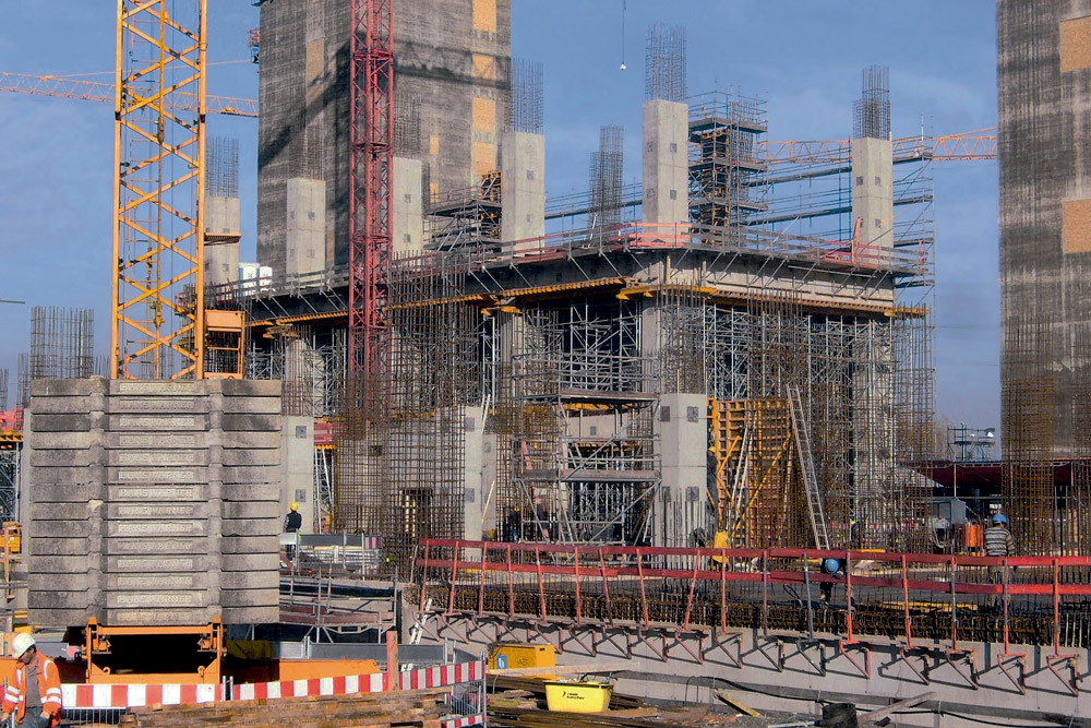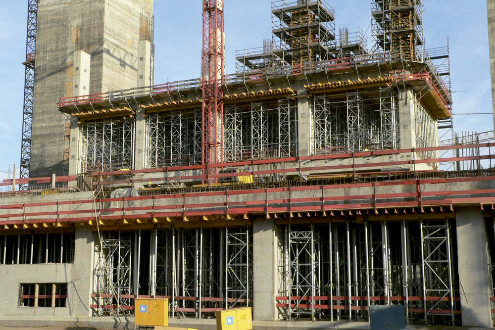Este edificio de varias plantas, de 100 m longitud, 50 m de ancho y una altura de 43 m, requirió un sistema de zapatas sólidas de 2 m de espesor. Debido a los requisitos estáticos, las columnas, losas y trabes debían tener grandes dimensiones. De ahí que de acuerdo a los tiempos de trabajo reducidos y los consiguientes ciclos de ejecución, se emplease una amplia gama de productos del portafolio en la obra. El proceso de ejecución de muros, columnas y demás estructuras fue rápido gracias al empleo de 3,000 m2 de Cimbra Modular ORMA. La amplia gama de paneles posibilitó al cliente seleccionar el adecuado en este caso ya que sus longitudes y anchuras permiten su adaptación a las necesidades de cualquier obra. Además, todas las columnas estuvieron equipadas con sus respectivas plataformas de trabajo, garantizando así la seguridad de los operarios en el proceso de colado y en los trabajos en altura.