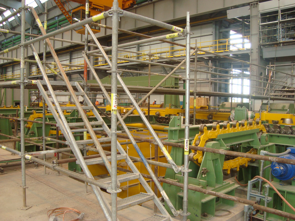 Se instalaron todo tipo de andamios: escaleras de acceso, andamios colgados, puentes peatonales provisionales, torres de trabajo y andamios adaptados a las diferentes geometrías de los equipos.
