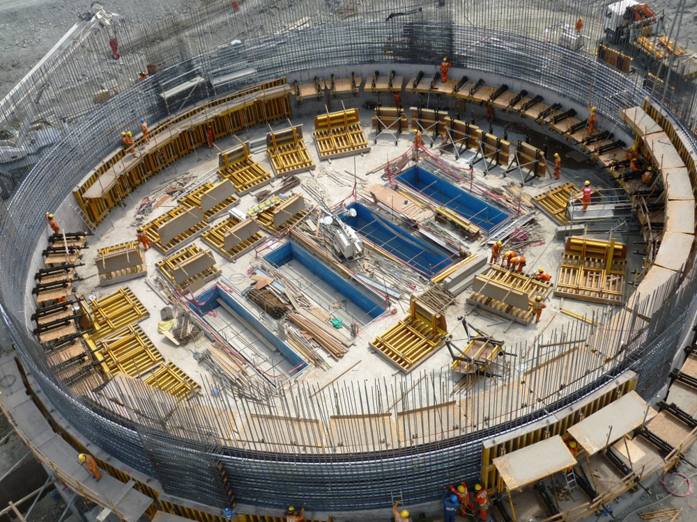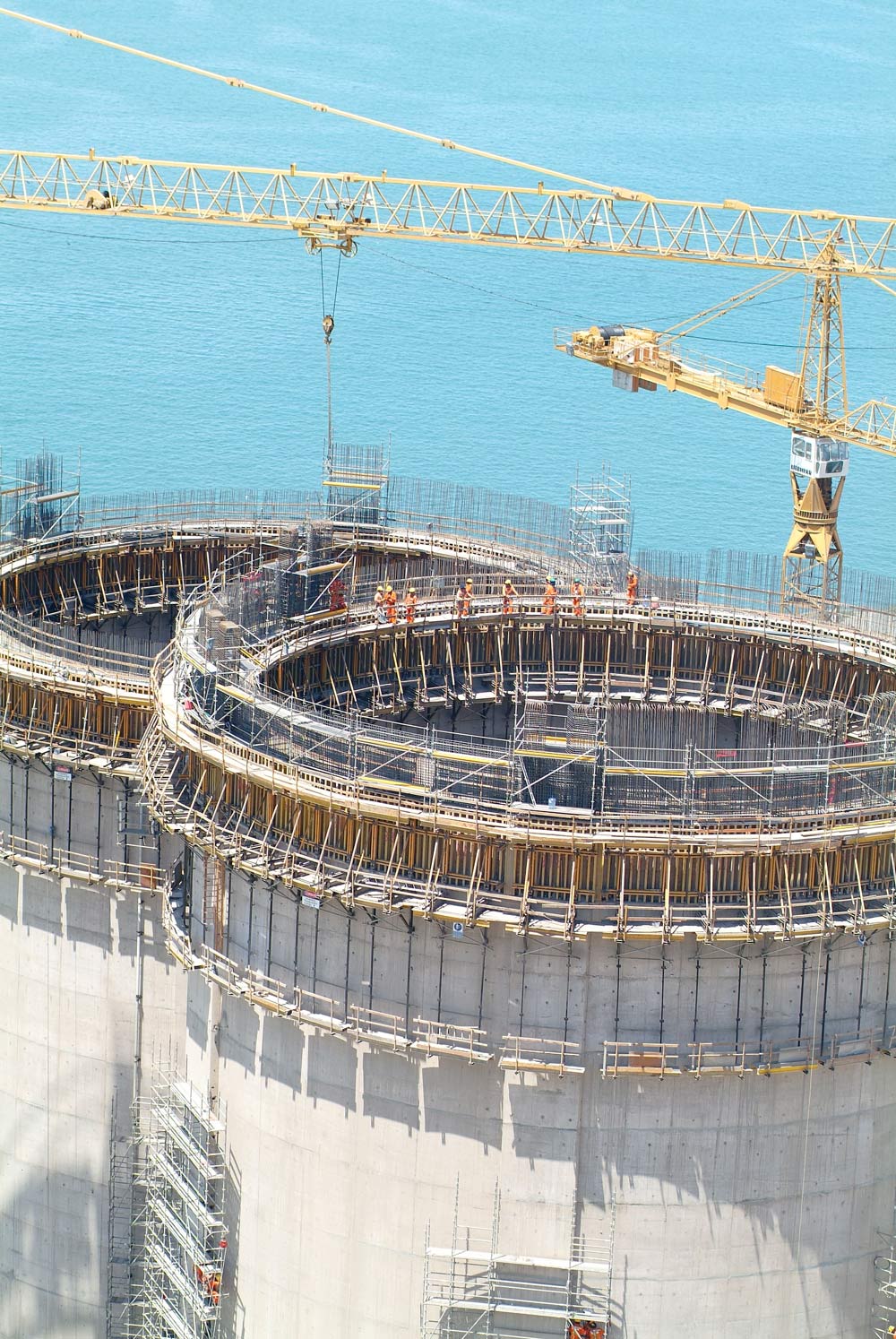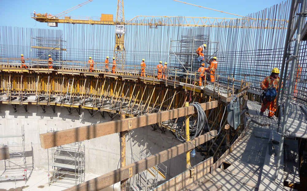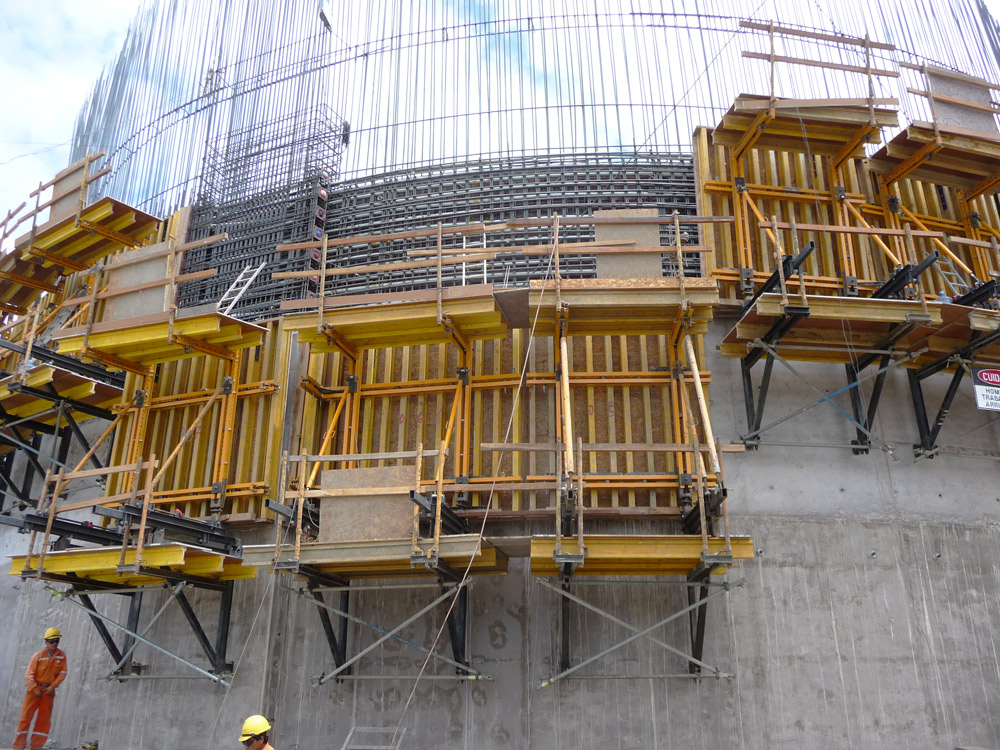 Sus elevadas dimensiones requirieron del empleo de sistemas amoldables a la geometría circular de cada silo que, al mismo tiempo, garantizaban el mejor acabado en el concreto. En cada silo, se empleó cimbra de forma ENKOFORM VMK, con 72 paneles de 3 m de altura y 2.65 m de ancho sobre consolas de trepado a una cara. Se realizaron 17 tongadas de colado.