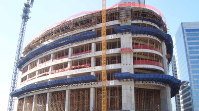 Dentro del proyecto residencial con base comercial, se ha construido una galería cónica como elemento central del conjunto cuya arquitectura destaca por su valor estético y funcional. ULMA ha participado con soluciones especializadas en encofrado y soporte, y sistemas como ENKOFORM V-100, Cercha MK y Cimbra BRIO para garantizar precisión geométrica, seguridad estructural y eficiencia en cada fase del proyecto.
