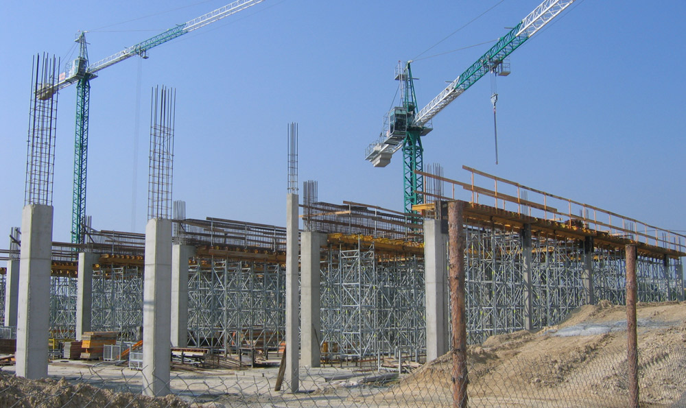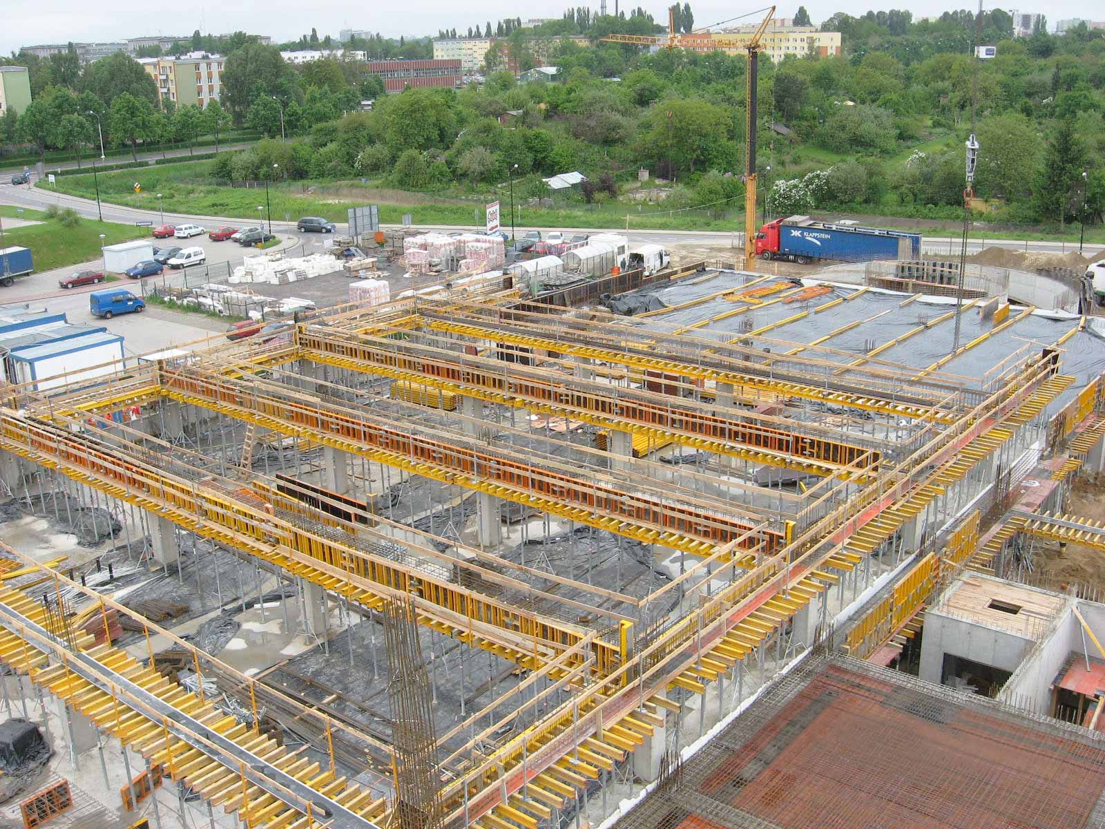 Las losas y trabes se ejecutaron con Cimbra ENKOFLEX sobre T-60 y Puntales ALUPROP. Una fila adicional de torres de apoyo se colocaron a lo largo de las trabes, así fue posible crear una plataforma de trabajo amplia y segura.