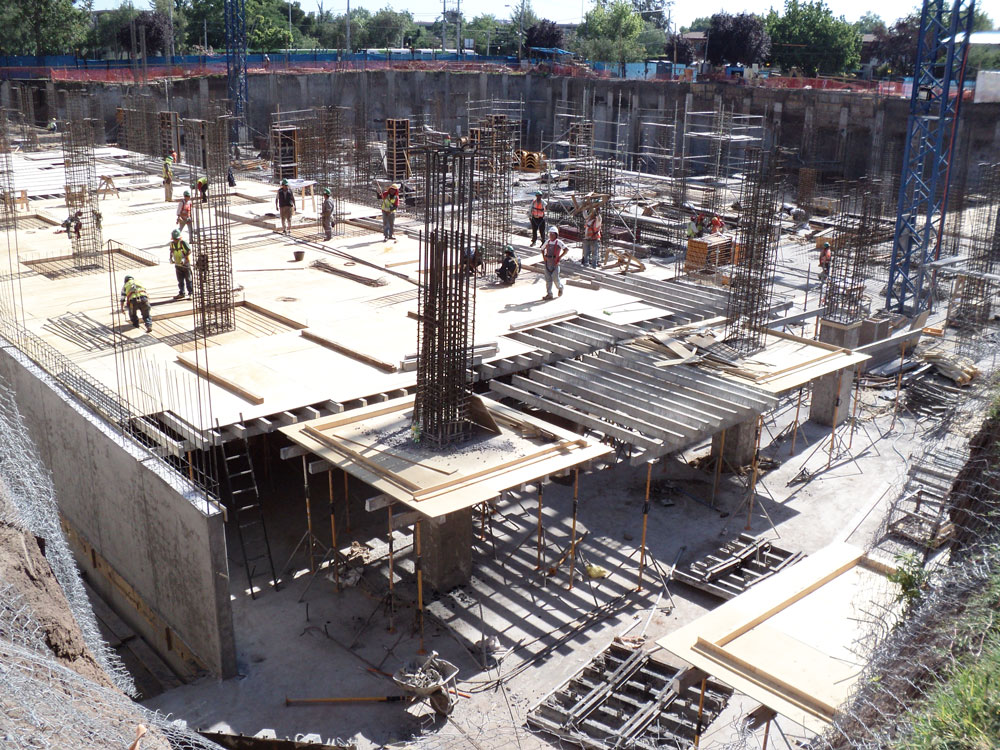 La cimbra vertical ORMA con modulaciones simétricas se utilizó para realizar los muros con acabados aparentes, además de columnas. Los muros curvos de huecos de escalera se realizaron con BIRA, cimbra circular metálica que posibilita los acabados requeridos.