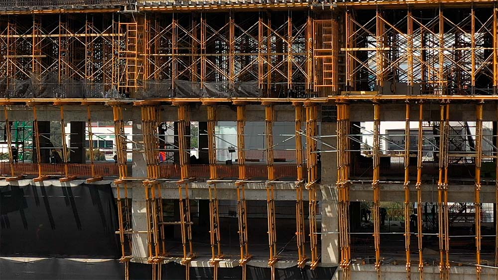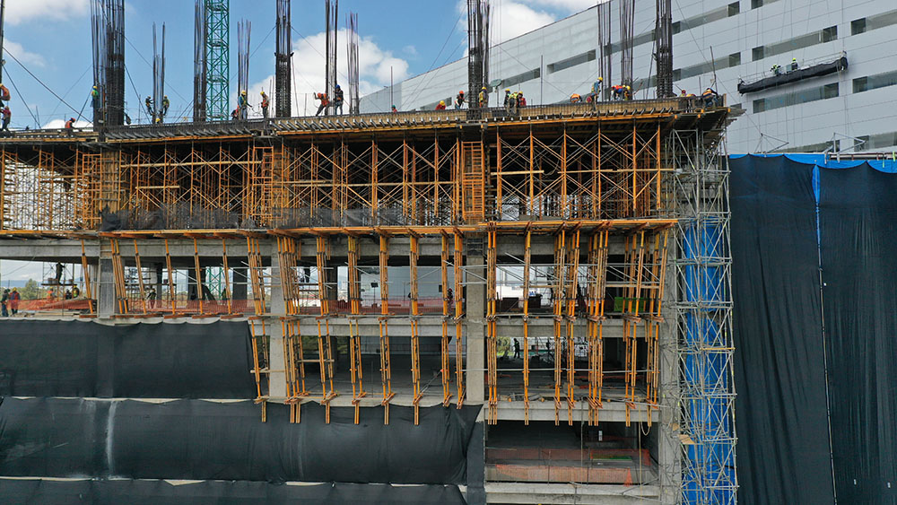 Para esta torre, la formula fue distinta. Se suministró el sistema de apuntalamiento de encofrado recuperable RAPID con puntales, tanto para los claros de 7.00 m a 10.00 m de losa, como para el apuntalamiento de las trabes en combinación con Cimbra G.