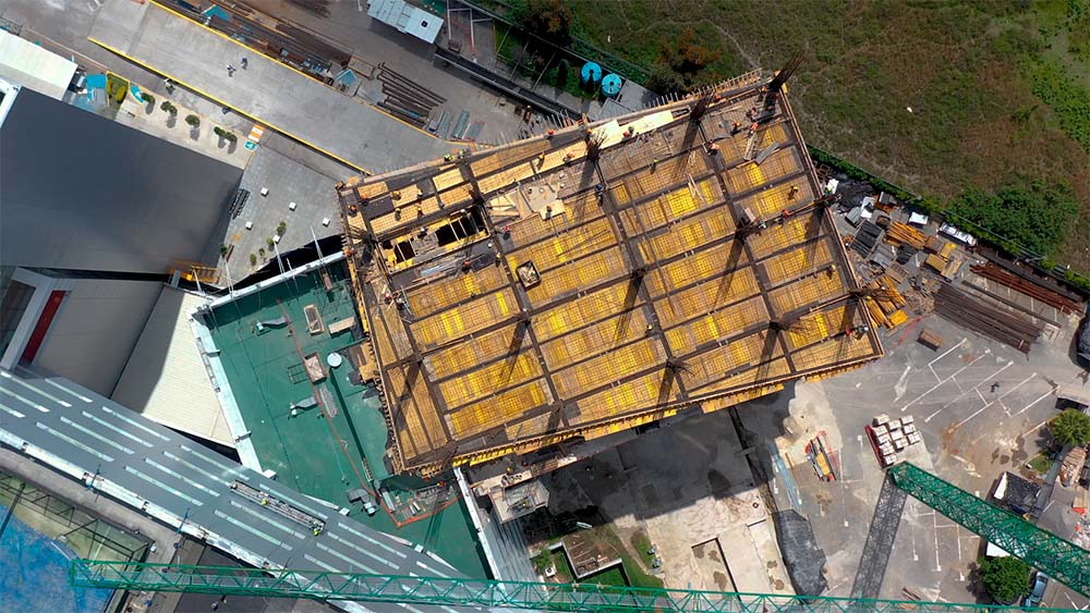La arquitectura de este proyecto implica un diseño que da la sensación de que la fachada “gira” generando grandes volados. Es importante señalar que, para ambas torres, en las áreas con cantilever de gran extensión, se desarrolló una solución integral que combinó CERCHAS MK ancladas en cada entrepiso, en las que desplantaban torres de Cimbra G, riostras, vigas HM, y vigas BTM con un acomodo independiente en cada volado. Esta propuesta de ULMA requirió un mayor nivel de ingeniería de detalle en el cálculo, logrando resolver hasta 8 metros de altura de entrepiso en cierto nivel y grandes volados.