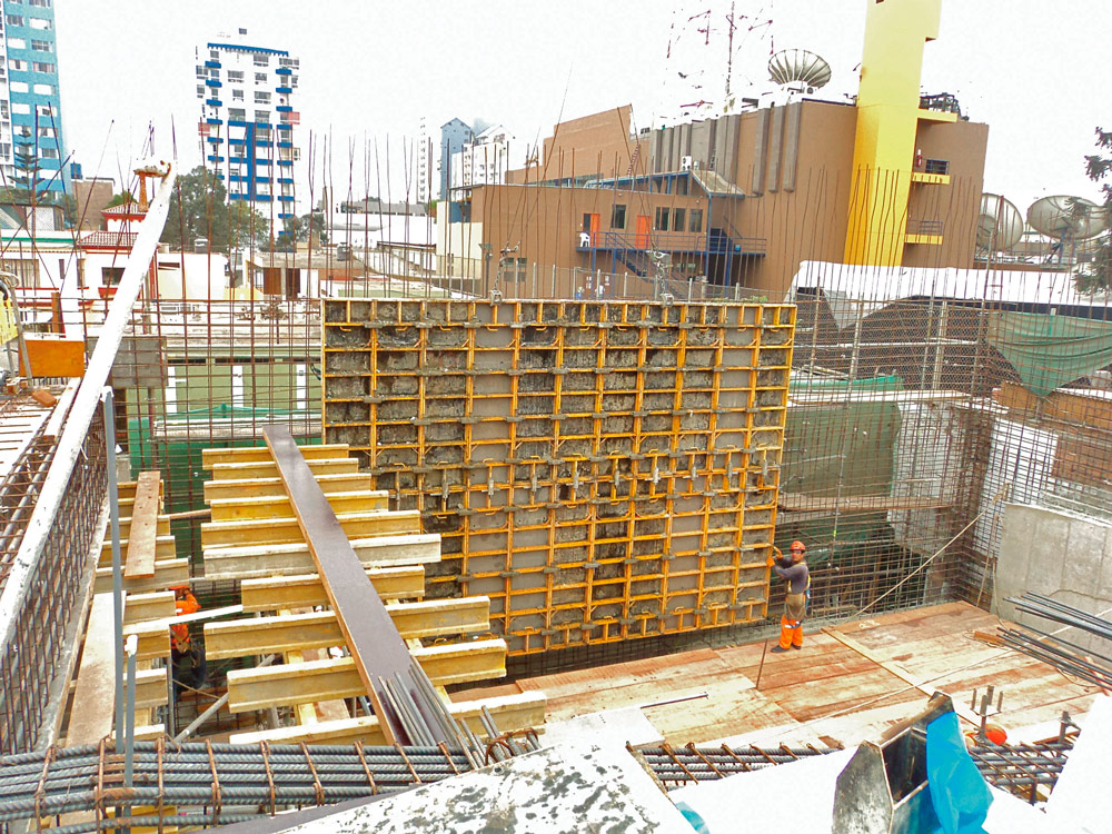 Ante estas premisas, se optó por cimbra vertical NEVI, de fácil montaje y pocos accesorios. Se montaron grandes paños de 8x4 m fácilmente transportables con grúa.