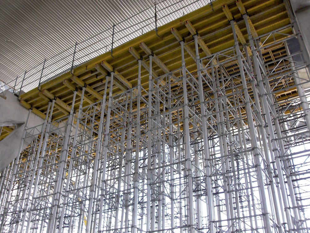 Para los 8 metros de altura que demandaba el diseño, se emplearon puntales de aluminio ALUPROP dispuestos en torres, es decir, amarrados entre sí. Los rendimientos de este producto, utilizado para la ejecución de las losas se incrementaron pues no fue preciso desmontar cada torre de 100 m3, sino que, después de cada uso, fue trasladada en su totalidad. De esta manera fue posible la reutilización de material, además de ahorrar en tiempos de trabajo ya que se evitó el continuo montaje y desmontaje.