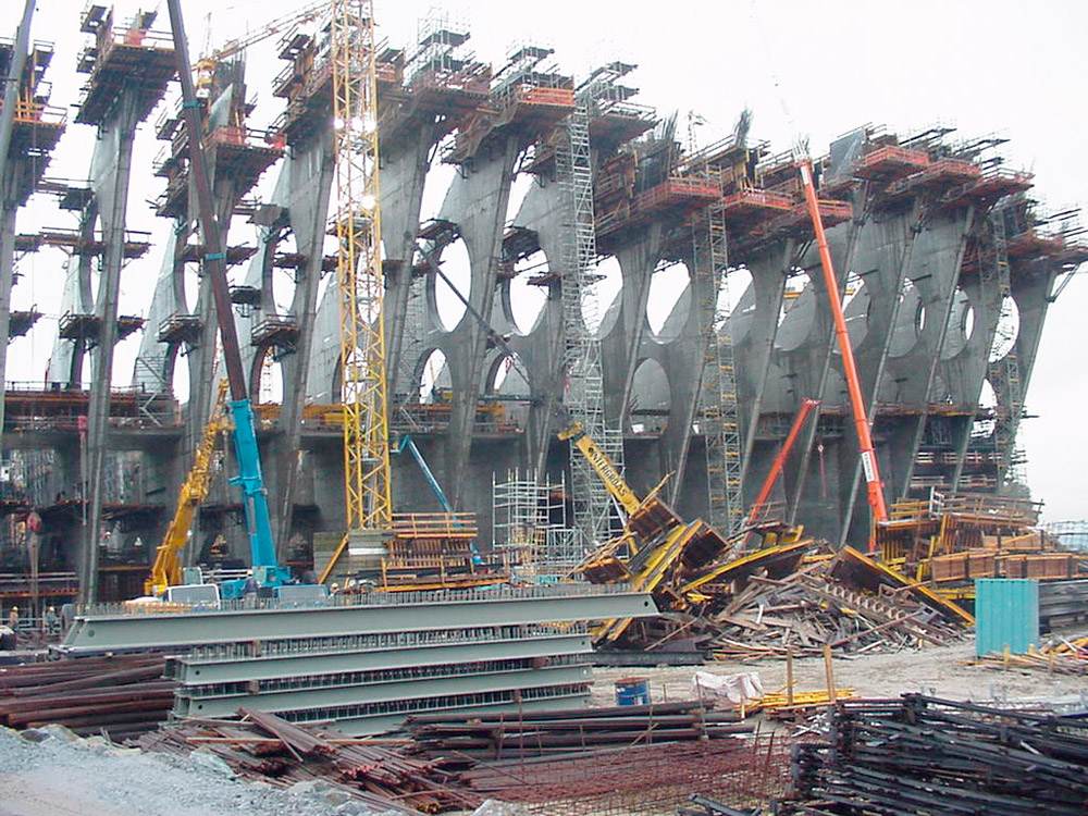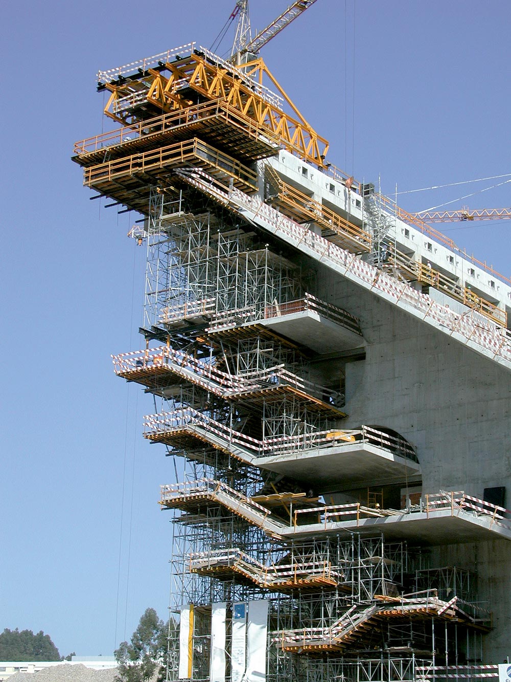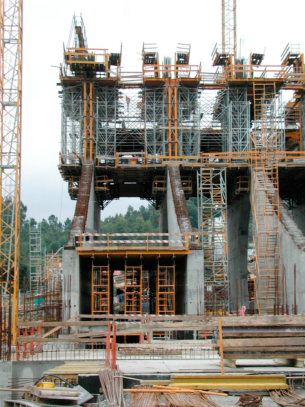 A 30 m de altura, los muros en su parte frontal presentan un voladizo de 13 m resuelto con el mencionado sistema, así como los tapes dorsales con Consola G, debido a la inclinación del muro. La cimbra ENKOFORM V-100 demostró su versatilidad y eficacia en la solución de las múltiples geometrías de esta obra.
