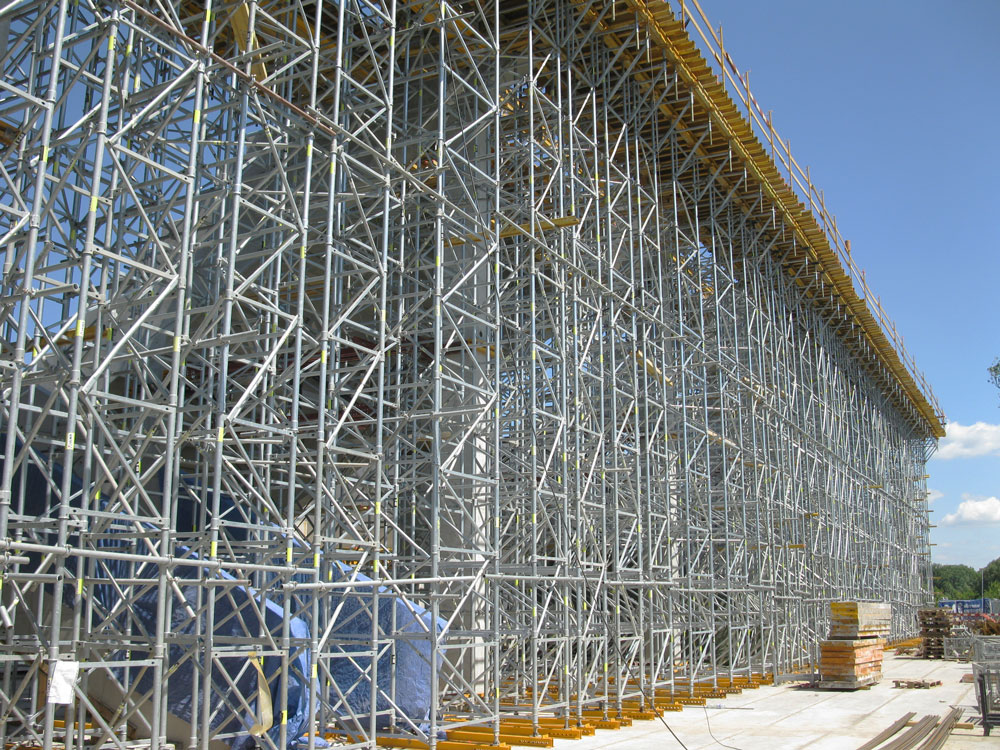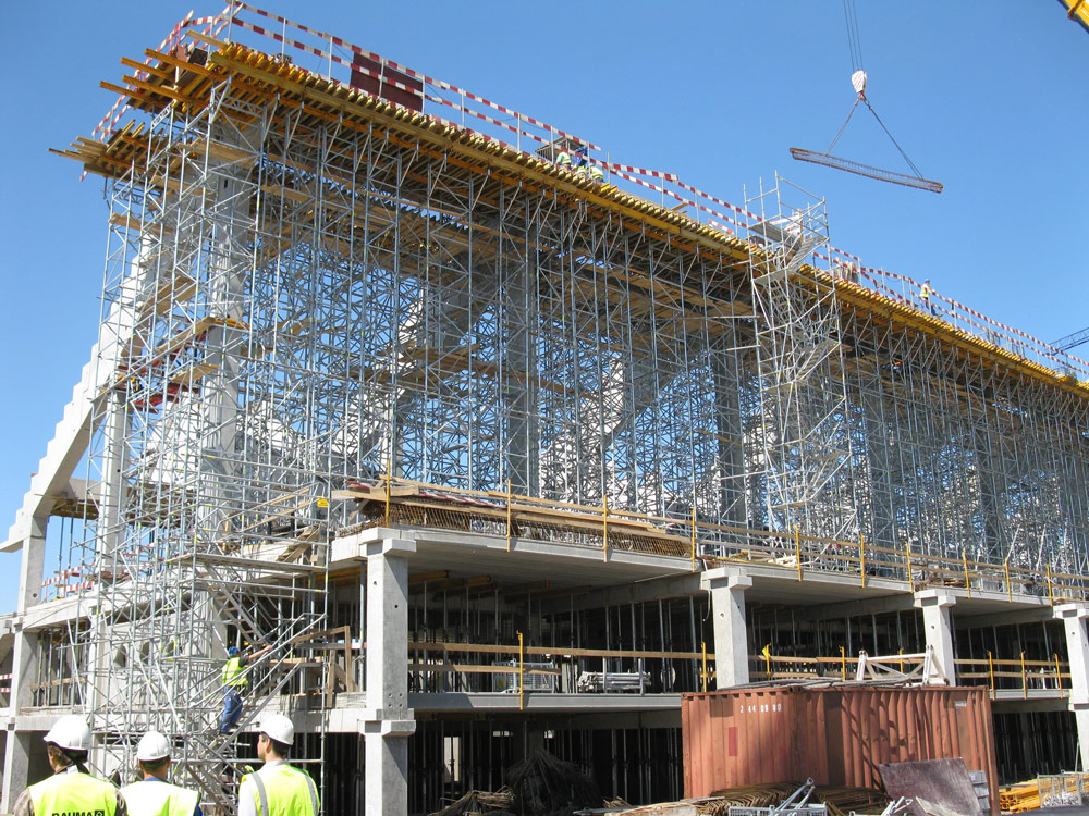 Las obras se iniciaron de forma simultánea en tres de las cuatro gradas (norte, sur y este). Las zapatas, los espesores de losa, muros y huecos de ascensor se ejecutaron con el eficaz sistema de Cimbra Vertical NEVI. Debido a los altos requerimientos arquitectónicos exigidos, se ejecutaron columnas de 60 x 80 cm con el sistema modular ORMA que permitió alcanzar una dimensión de columna de 115 x 115 cm con los mismos paneles. Ambos sistemas modulares demostraron su rentabilidad ya que sus paneles pueden unirse con un mínimo de piezas.