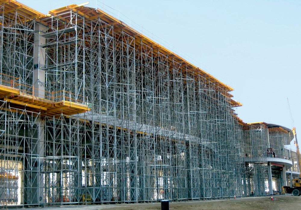 Los altos ritmos de ejecución y los exigentes plazos de entrega provocaron la realización de trabajos en paralelo. Mientras se ejecutaban los últimos trabajos en altura, el montaje de la estructura metálica, en la parte inferior se instalaron las cristaleras de la fachada. Para evitar la caída de cualquier tipo de material, se elaboró una protección perimetral mediante el sistema BRIO, un andamio seguro y polivalente, capaz de soportar desde los apuntalamientos más ligeros hasta los más pesados. De esta manera, fue posible trabajar a cualquier altura con todas las medidas de seguridad garantizadas.