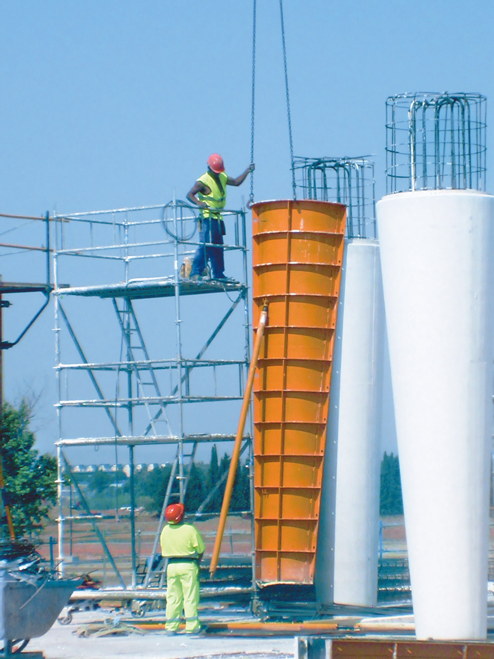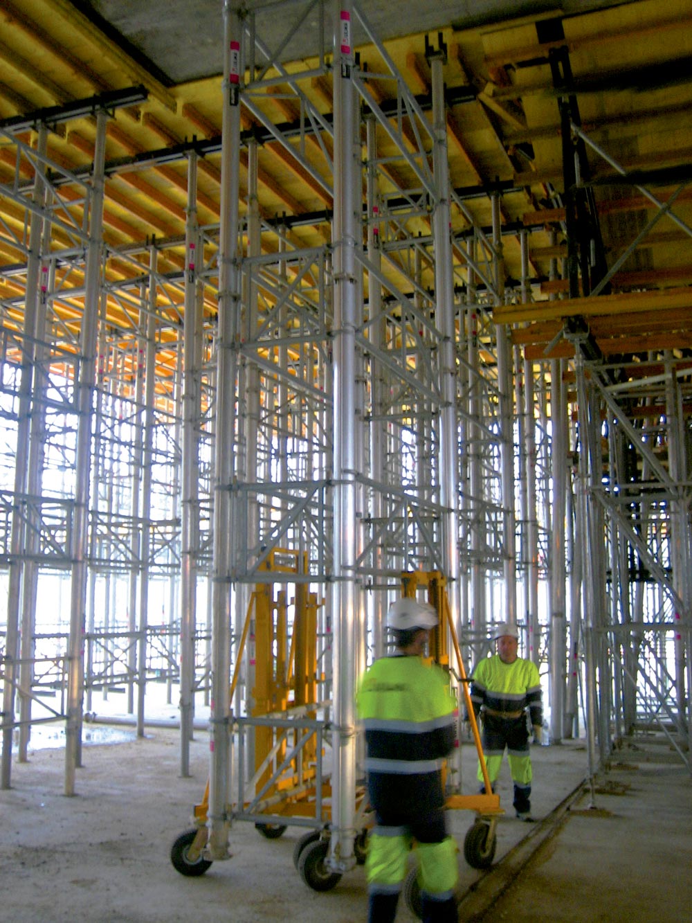 Su montaje se realizó con módulos de apuntalamiento que se desplazaron con medios auxiliares. El traslado mecánico de las torres se efectuó mediante manipuladores telescópicos. Así, los 16 m de torre se manejaron con el mecanismo telescópico y la grúa.