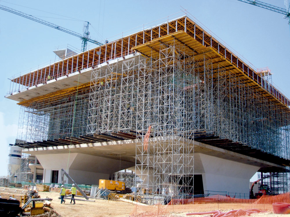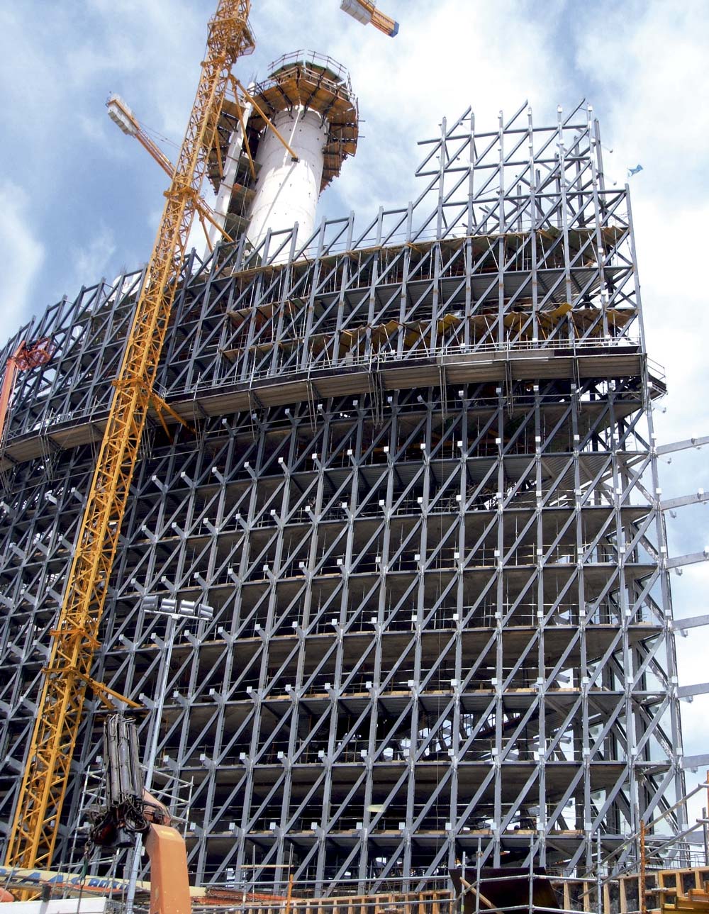 La columna vertebral del proyecto consta de dos núcleos, separados 20 m entre sí, que permiten sostener los 8,000 m2 de fachada de cristal. Un edificio tan peculiar requirió de soluciones particulares. Así, las complejas formas redondeadas se consiguieron mediante el empleo de cimbras realizadas para esa obra. Estos productos se utilizaron sobre sistemas de trepa para, de esta forma, alcanzar los 70 m. Los trabajos de altura necesitaron pequeñas losas intermedias llevadas a cabo con apuntalamientos y Andamio Multidireccional BRIO, además de una seguridad extrema que se mantuvo durante toda la obra.