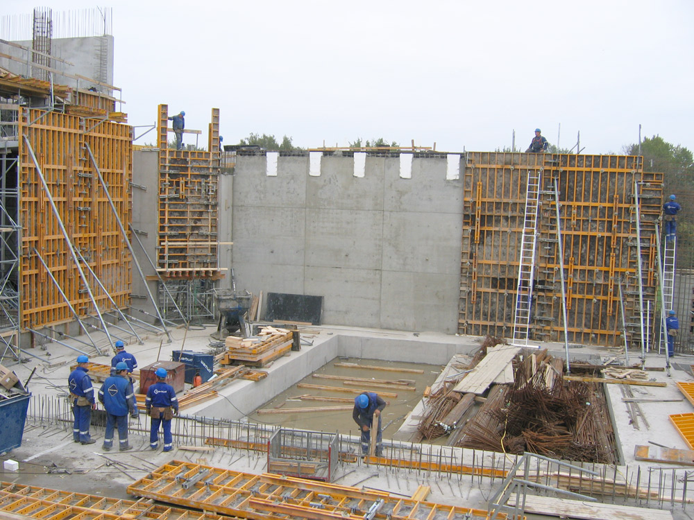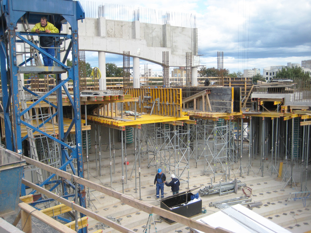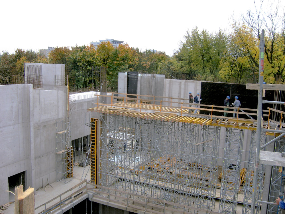 Los muros del salón principal, la zona de mayor altura de todo el edificio, se llevaron a cabo en ciclos de colado de 6.6 m de alto, con el empleo de paneles de 2 x 3.3 m, de cimbra modular. En todo momento se utilizaron plataformas de trabajo y de colado que garantizaron la seguridad de los trabajadores durante toda la obra.