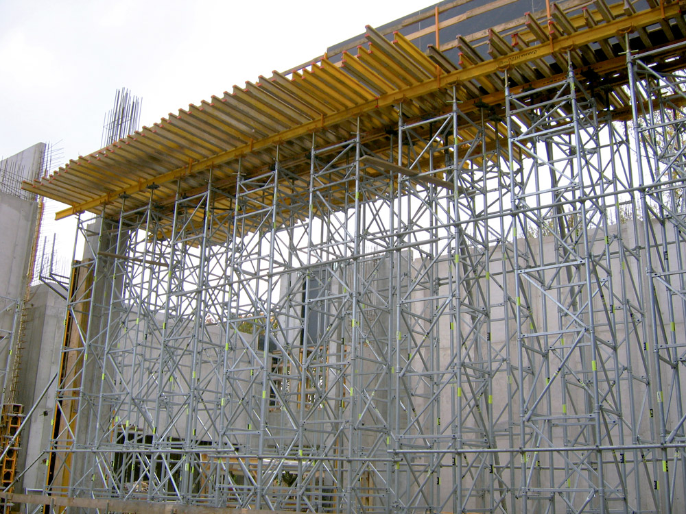 El reto fue la ejecución, en una sola fase, de muros de 10 m y columnas de 15 m de altura de concreto aparente, sobre los que se realizaron trabes horizontales de concreto. En la construcción de estas trabes, se utilizaron torres T-60 de 11 m de altura y cimbras verticales modulares.