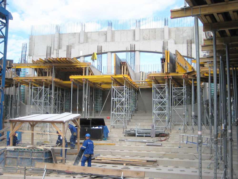 El muro de 10.8 m de altura que separa el escenario del auditorio se colocó a una cota de 16 m de altitud. Como estructura de apuntalamiento, se emplearon torres de T-60 durante el colado del muro, realizado en dos fases de 5.4 m con paneles de cimbras verticales.