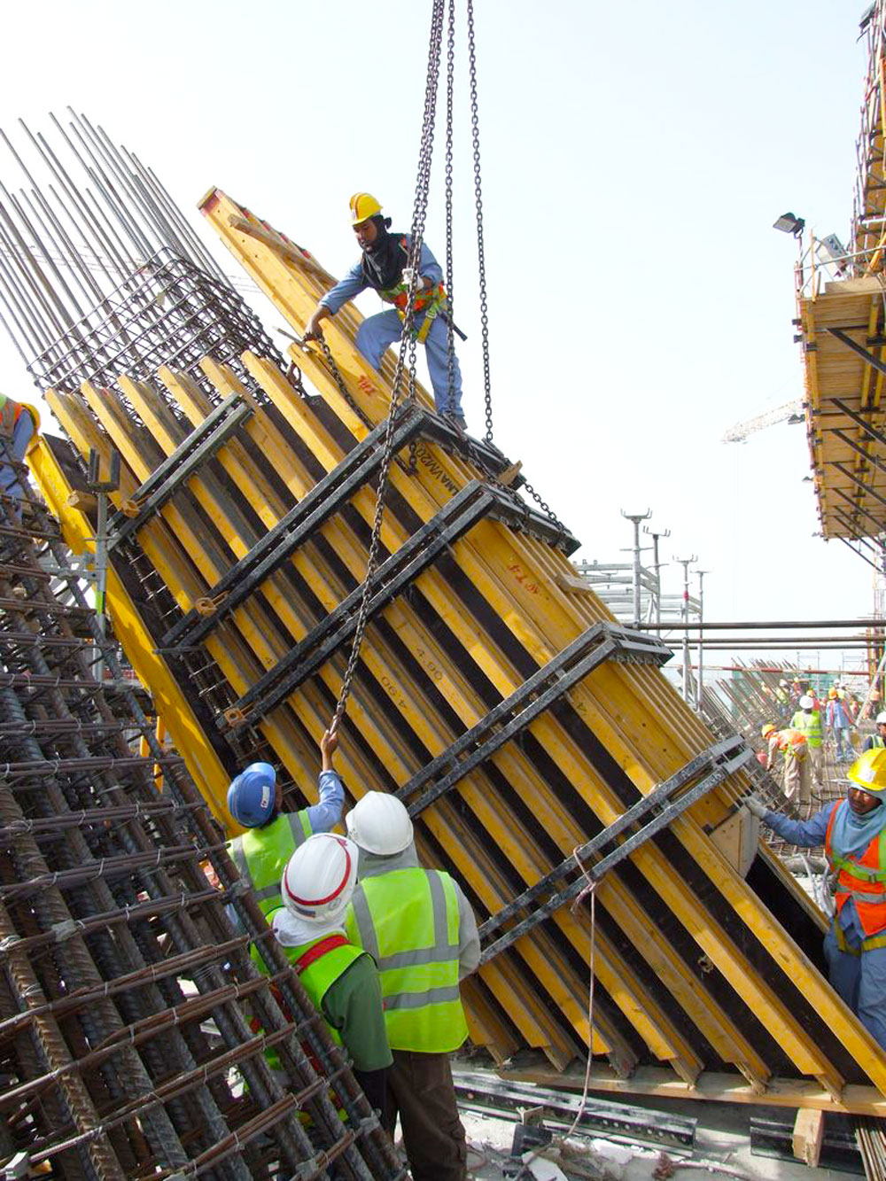 Los muros de apoyo e inclinados, de forma variable, además de las estructuras de núcleo se ejecutaron de manera rentable con la Cimbra Vertical ENKOFORM V-100. Este sistema solucionó la ejecución de varias estructuras, con diferentes geometrías, consiguiendo altos rendimientos y excelentes acabados. Con sus piezas estándares, riostras metálicas y trabes de madera, se realizaron paneles a medida obteniendo las configuraciones complejas del proyecto.