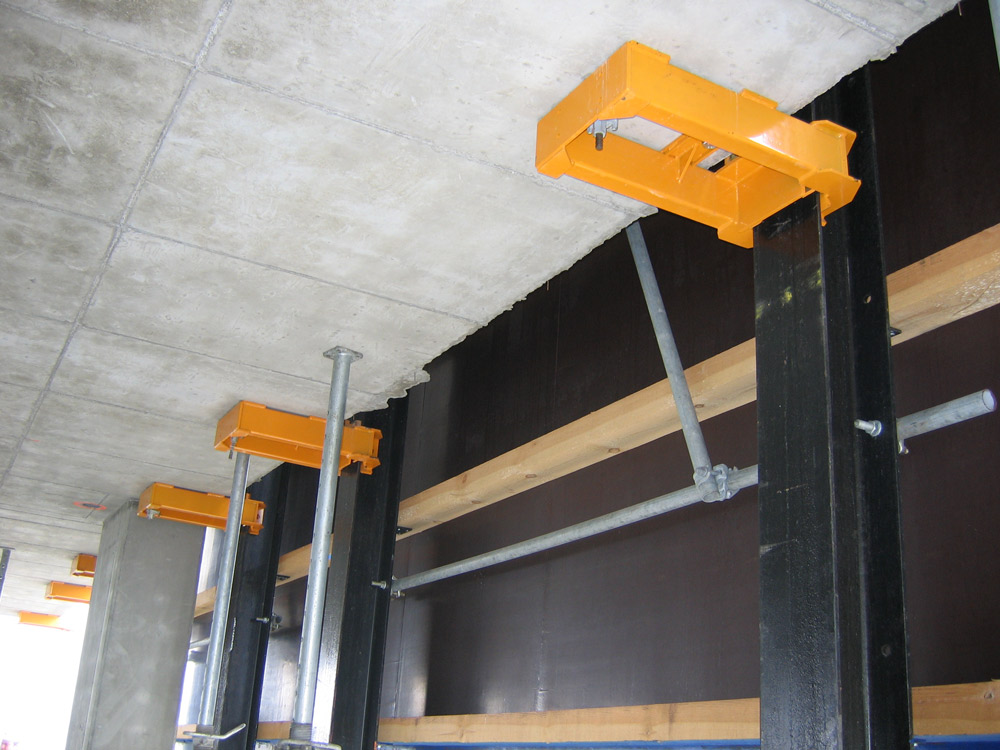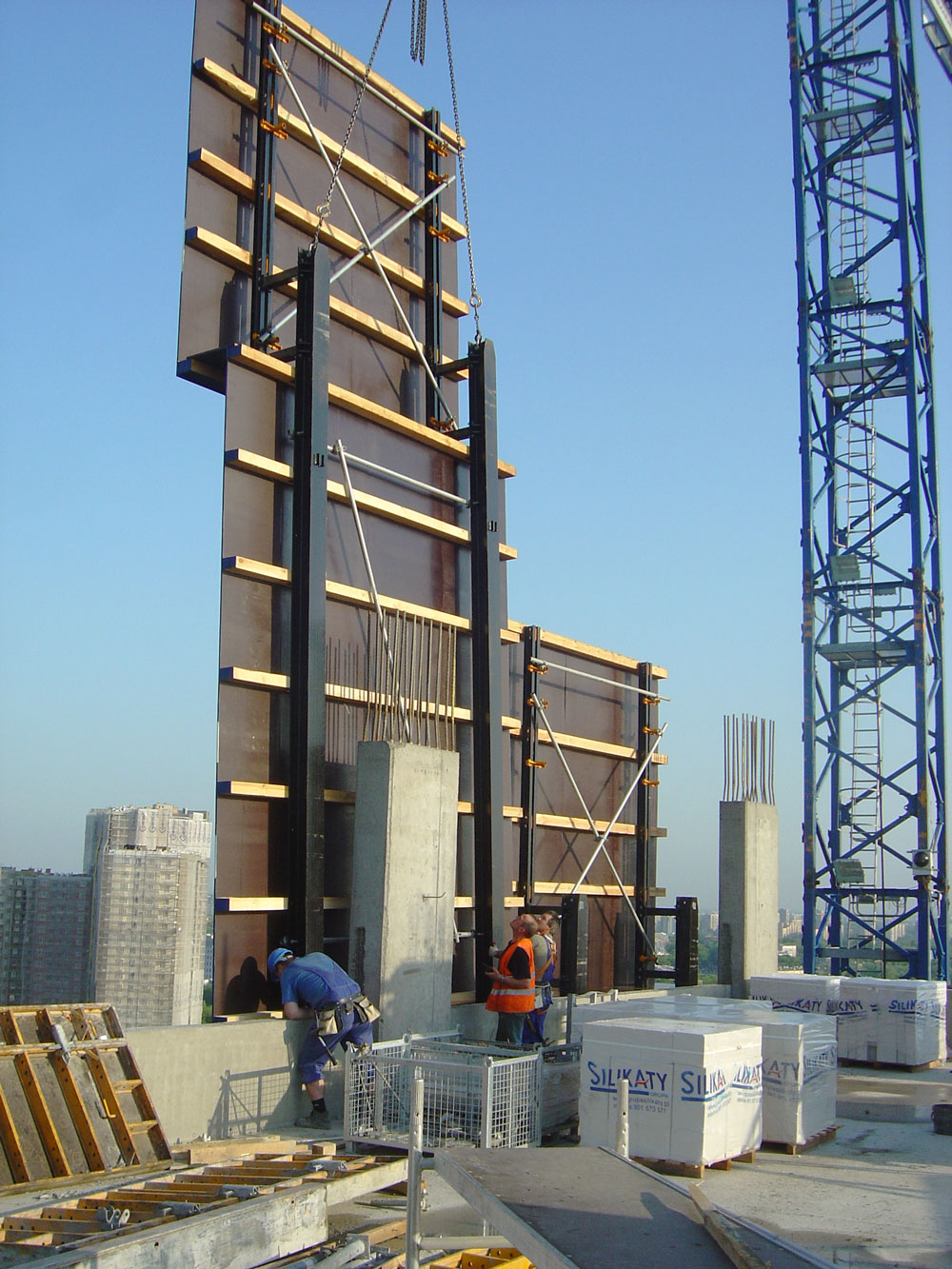 Además, se suministraron durante tres meses 33 protecciones perimetrales, de 10.5 m de altura cada una, utilizadas para asegurar las zonas de trabajo al ejecutarse los pisos de forma consecutiva. Así los operarios pudieron trabajar de forma eficiente y protegidos del viento y de las inclemencias meteorológicas a grandes alturas. El mecanismo se basa en un conjunto de dos mástiles unidos entre sí por trabes de acero y trabes de madera. Cada mástil, suspendido de un par de cabezales montados en las losas, determina el sentido de movimiento de cada protección. Gracias a la eficacia de este sistema, la ejecución del perímetro exterior de las losas superiores resultó sencilla, además incrementó de forma considerable los ritmos de trabajo con el consiguiente ahorro de tiempos.