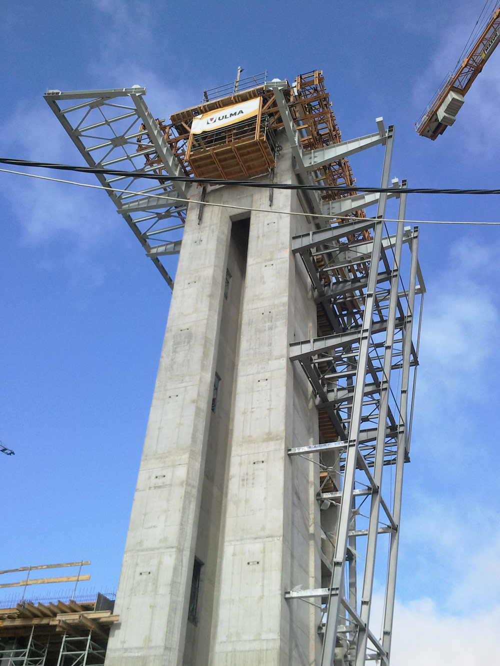El sistema autotrepante ATR ejecutó dos de los muros externos paralelos, de 90 cm de espesor. Los dos restantes, con espesores de entre 15 y 25 cm y elementos estructurales de acero sobresalientes, impidieron el uso del sistema ATR.