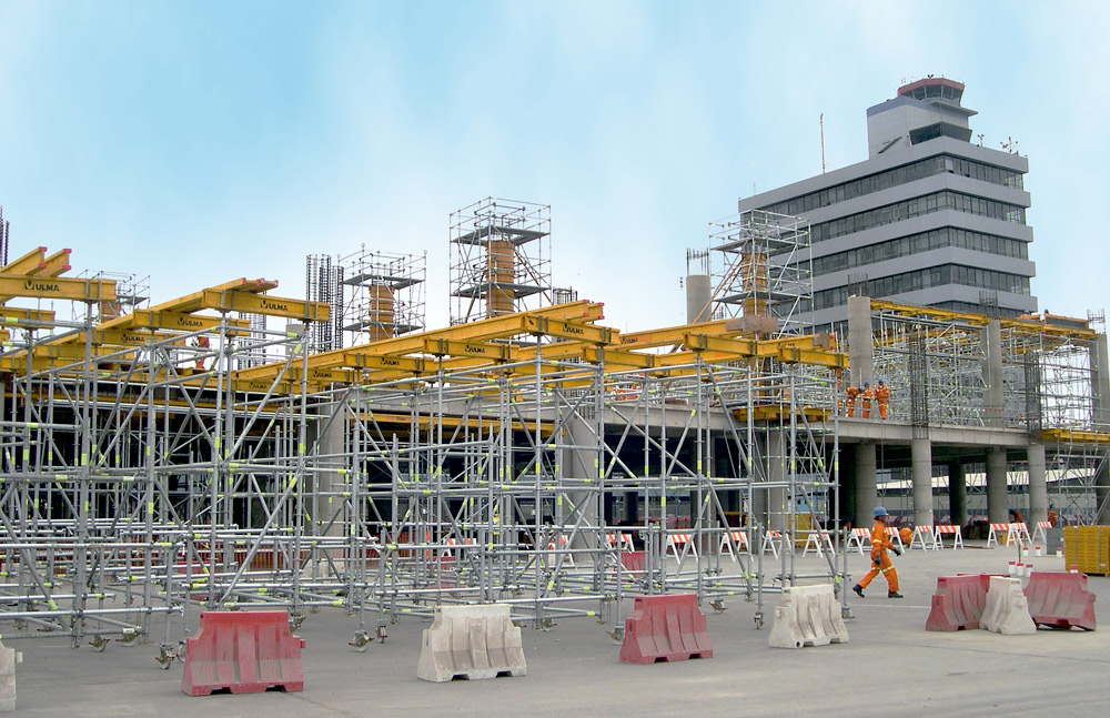 El Andamio Multidireccional BRIO permitió realizar los trabajos sin interrumpir la actividad y el tránsito de pasajeros. Los ingenieros plantearon como solución una plataforma continua realizada con un andamio colgado de la losa superior de la estructura en la terminal. El anclaje se efectuó con barras roscadas, trasmitiendo las cargas a la losa mediante Vigas DU, ajustadas con tuercas hexagonales. Se cubrió un total de 6,000 m² con Plataformas BRIO y 4,000 m² de plataforma con tablero tricapa. El andamio contó con los máximos niveles de seguridad, tanto para los operarios como para los usuarios de la terminal, y demostró su capacidad de adaptación a cualquier geometría.