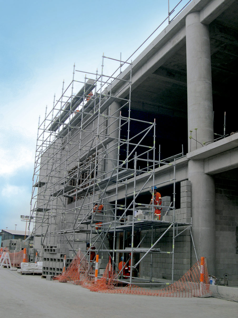 Además, se instalaron con sistema BRIO plataformas a distintos niveles para solucionar el cerramiento con bloques de concreto. Provistas de escaleras, facilitaron el acceso provisional a las plantas de aquellas estructuras que se iban ejecutando.
