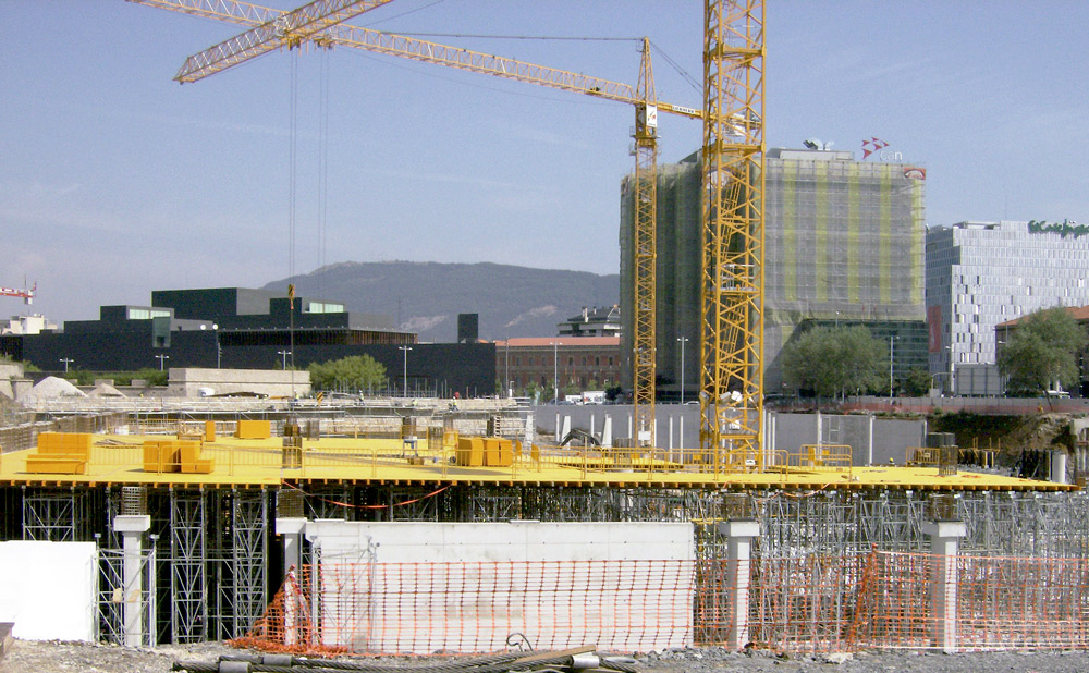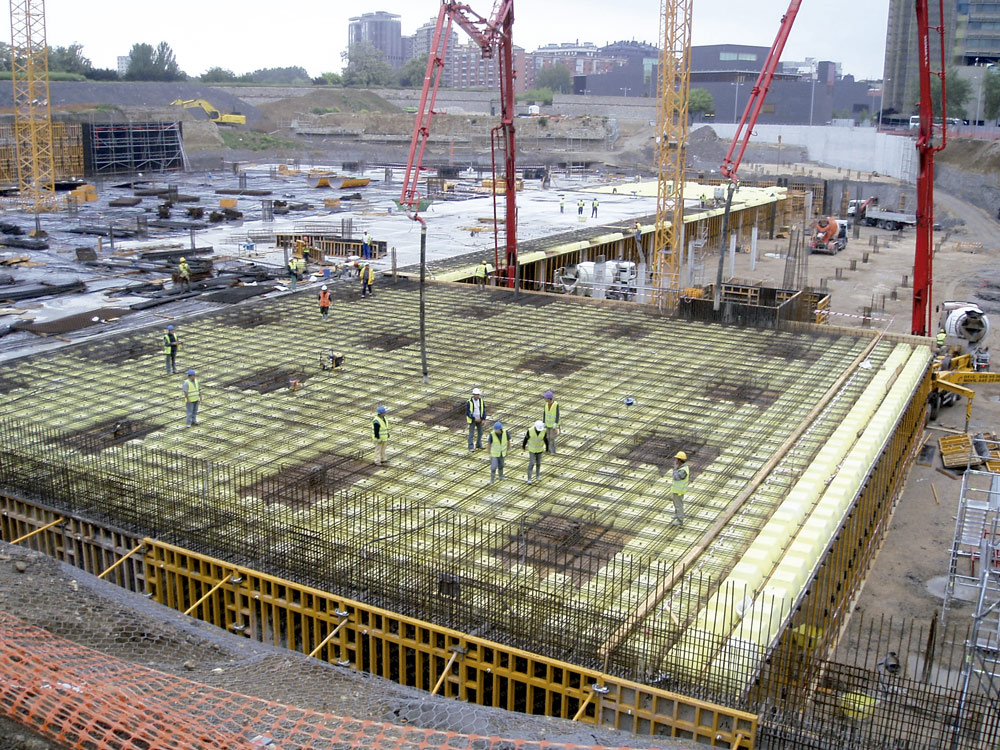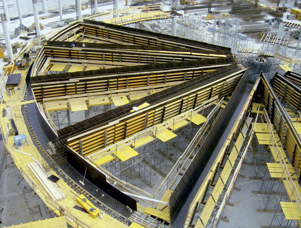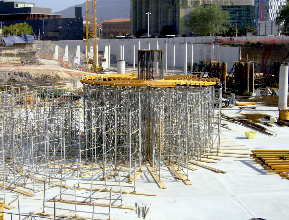 En la ejecución del núcleo central del edificio se empleó como cimbra de las trabes, ENKOFORM HMK y un apuntalamiento que se adaptó a la geometría radial.