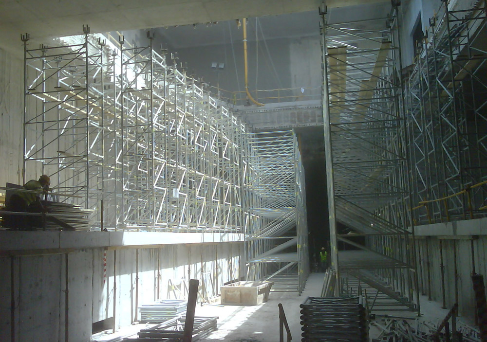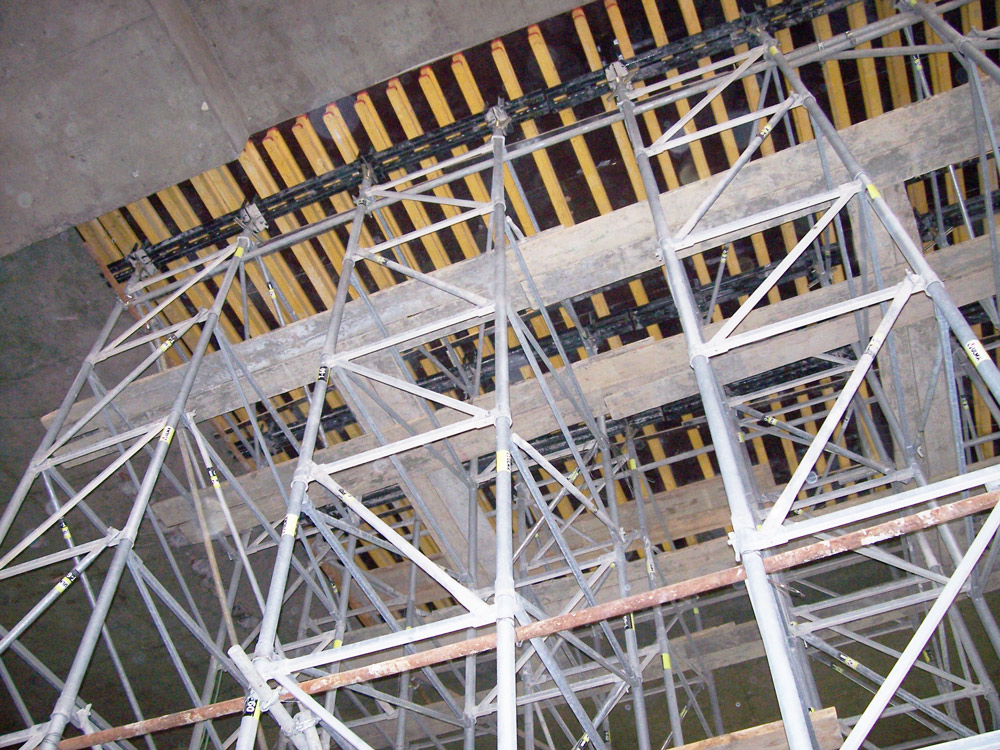 Como en todos los casos, tanto el Sistema ENKOFLEX como el resto de los productos instalados dispusieron de los más altos estándares de seguridad y calidad. La transmisión de cargas hasta una altura de 12 m entre losas se realizó con torres de Cimbra T-60 junto con Puntales EP. Las torres de apuntalamiento, de rápido y sencillo montaje, facilitaron su traslado, de una ubicación a otra, ya que no fue necesario desmontarlas para su uso en la siguiente puesta.