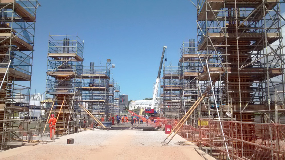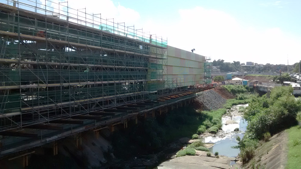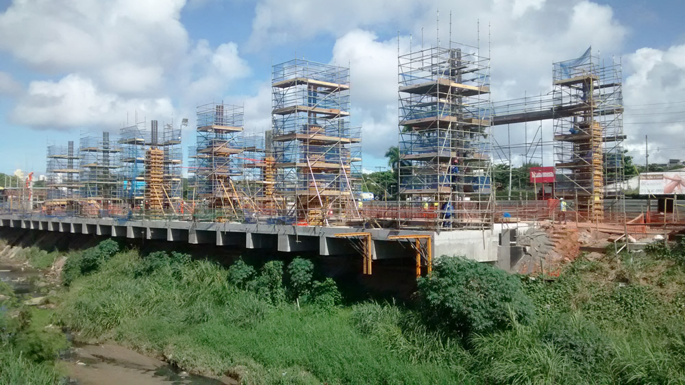 Tiene esta obra, la particularidad de no exigir aberturas para el paso de maquinaria, por lo tanto se optó por torres aisladas con un costo inferior en relación a otras estructuras metálicas normalmente utilizadas. Se ha utilizado BRIO como apuntalamiento y como andamio en los primeros colados y la T-60 cuando se exigía una carga mayor.