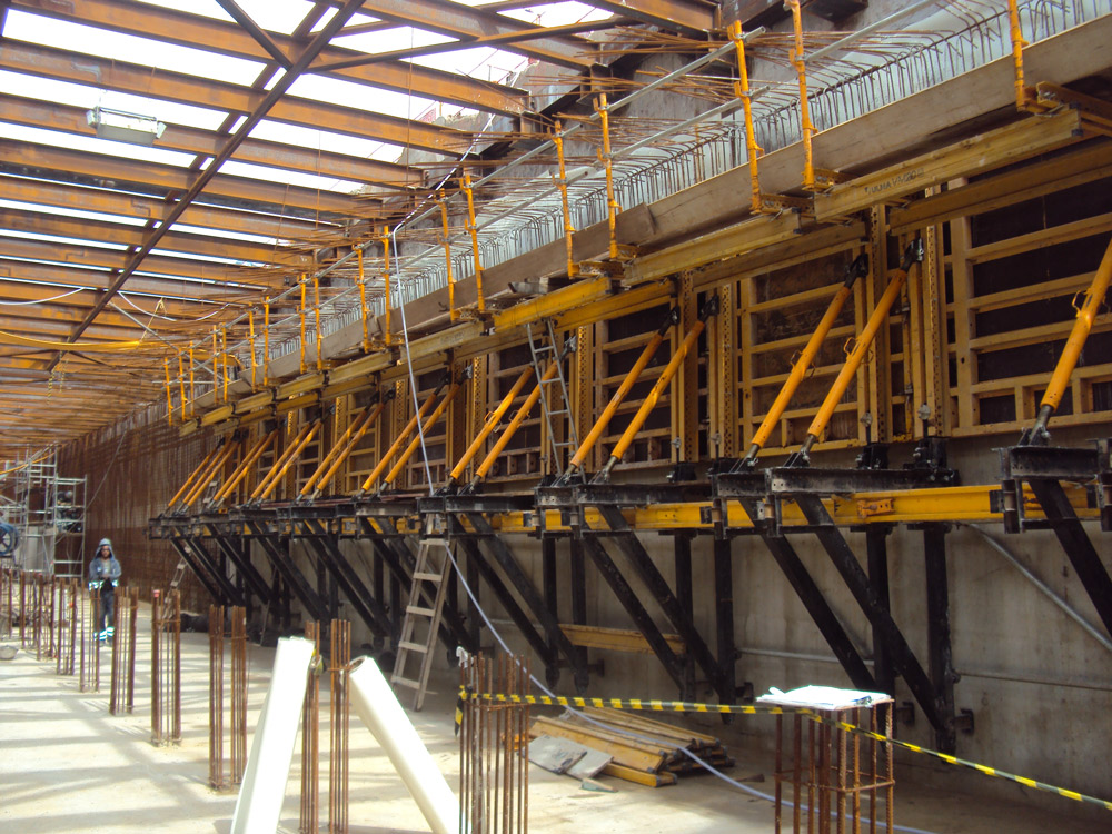 Los muros laterales a una cara de 5.7 m se han realizado con Cimbra Modular ORMA y cerchas que se han trasladado con carros de una puesta a otra sin la necesidad de ser desmontadas. Por razones de ejecución, se han llevado a cabo en dos fases, la primera con cerchas SMK y la segunda con consolas de trepado a una cara SBF.