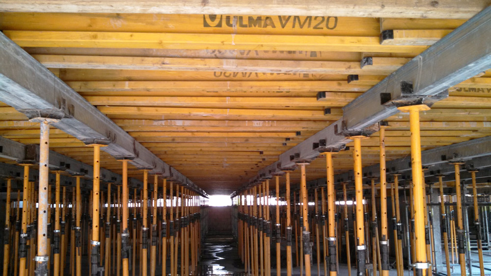 ULMA ha aportado una solución integral a este edificio constituido estructuralmente en su totalidad con concreto reforzado. La ejecución de los muros verticales se solucionó utilizando la gama completa de cimbra NEVI, acompañándolo de riostras H-120 y tensores cuando las elevadas presiones del concreto así lo han requerido. La solución más relevante fue la adoptada para los muros perimetrales, el tener edificios colindantes a una separación de 30 cm, imposibilitaba la utilización de sistema de trepado y se tomó la decisión de realizar unas cerchas metálicas con riostras H-120 y tensores dentro del edificio, de las cuales cuelgan las dos caras de cimbra ORMA.