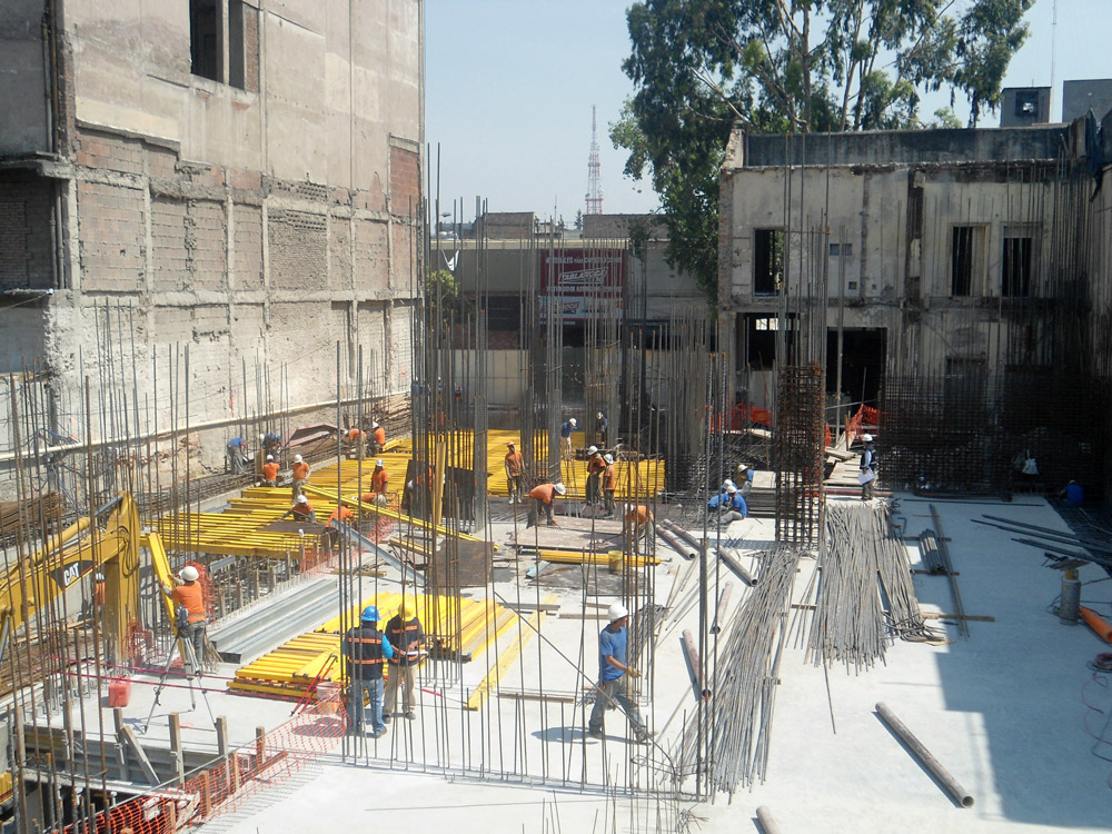Las losas se solucionaron de dos maneras: las alturas de apuntalamiento de 6-8 m de altura, con cimbra BRIO y las alturas de apuntalamiento de 3.60 m con cimbra G con excepción de los puntos singulares como balcones y trabe circular del núcleo central, donde se ha optado por la solución de cimbra BRIO, por la versatilidad de este material. En todos los casos son elementos que han venido acompañados de cimbra ENKOFLEX.