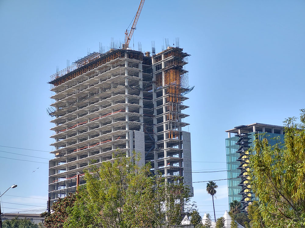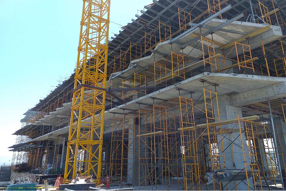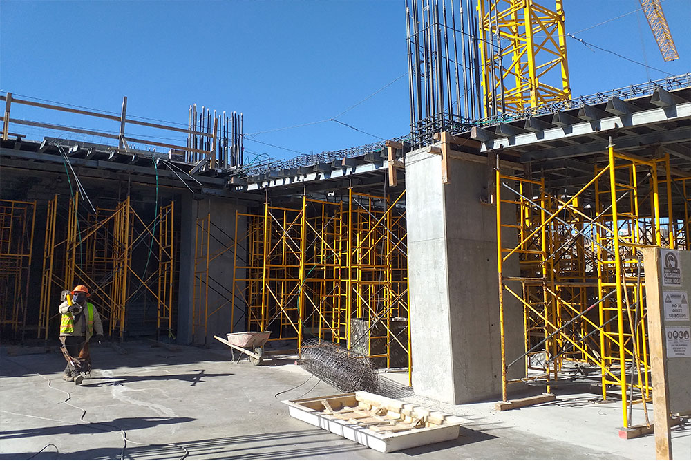 Losa: La geometría del edificio es muy peculiar ya que cada losa tiene forma de zigzag. La colocación de la estructura metálica de los antisísmicos es un reto por lo robusto y pesado de esta estructura. En nivel 18 con su volado de casi 4 metros y su doble altura requiere de un sistema de cimbra que pueda soportarlo. El sistema de andamio Cimbra G para las dobles alturas y el volado del N18 será de mucha importancia para la solución.
