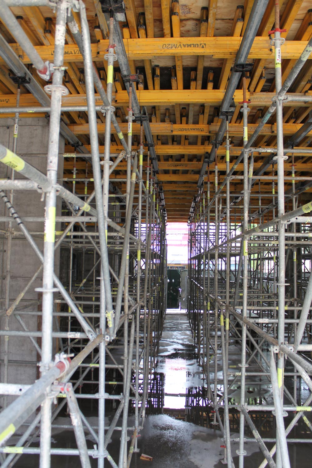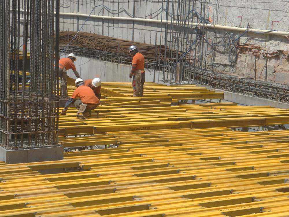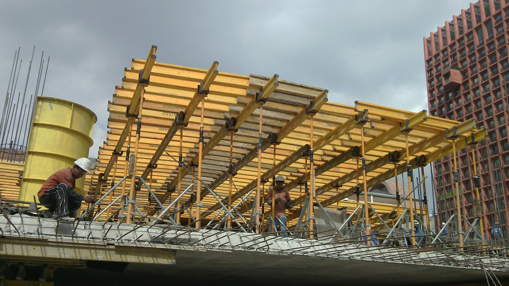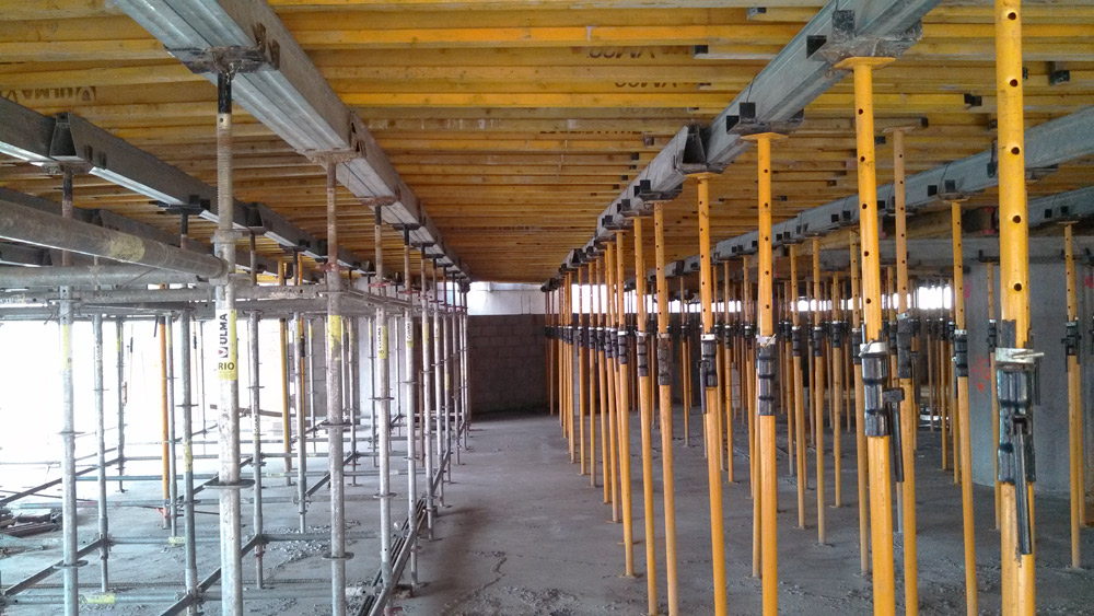 Losas: Debido a la ausencia de trabes, existen losas con espesores de 35 a 50 cm, los cuales se les dió solución tomando en cuenta la altura de entrepiso y espesor, se utilizó el sistema ENKOFLEX que consta de puntales normales, Vigas VM20 ó BTM como primera tramada y Vigas VM 20 como segunda tramada. Además también se utiliza el sistema BRIO en zonas en donde los puntales no tienen alcance, en el caso de losas perimetrales en donde necesitamos pasillo y protección de trabajo se utilizan amplias plataformas para brindar la seguridad requerida.