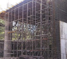 Columnas: Existen columnas circulares y rectangulares. Para las de sección circular se utiliza el sistema CLR fabricados especialmente para este edificio, y para las de sección rectangular se utiliza el sistema NEVI y ORMA debido a su fácil manejo y adaptabilidad del panel universal.