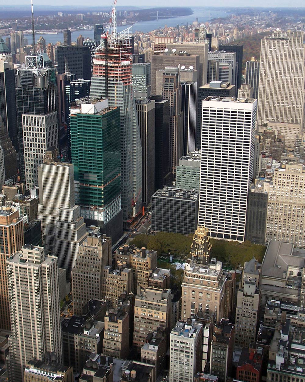 Su forma está planteada de manera que proporciona un plano orientado al sur, resaltando así su relación con Bryant Park y ofreciendo vistas dentro y fuera de la estructura.