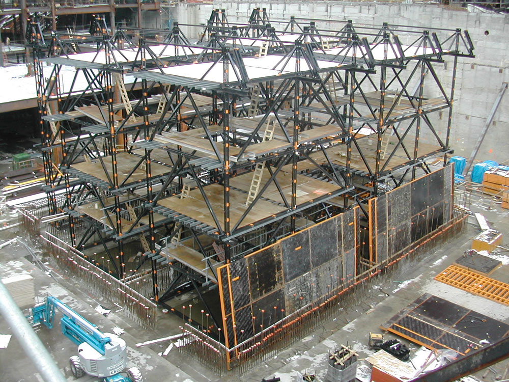 Asimismo este sistema permite el montaje y preparación de los mecanismos de elevación y sus plataformas antes que las cimbras. Funciona a modo de una torre de elevación, anclándose a los muros ya ejecutados de la estructura.