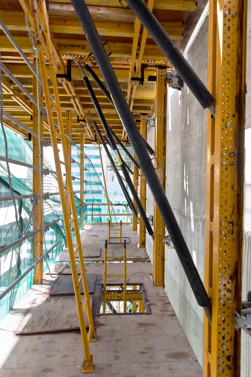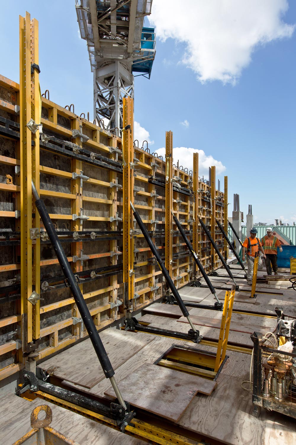 ULMA puso a disposición de la obra el Sistema Trepante Guiado RKS, como plataforma para la cimbra de los muros exteriores, y la protección perimetral HWS.