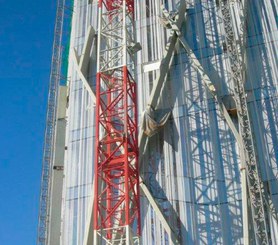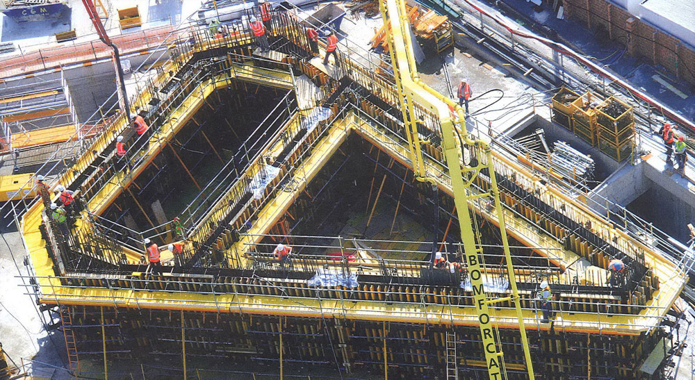 Para evitar agujeros en el concreto, se realizaron colados de muro de 4.50 m de altura. El empleo de una cercha de riostras y tensores permite que las barras roscadas no crucen el muro al situarse en la parte superior e inferior de cada tongada. La Consola 2000, con compensaciones de madera en las esquinas interiores, facilitó la adaptación a la geometría trapezoidal del núcleo.