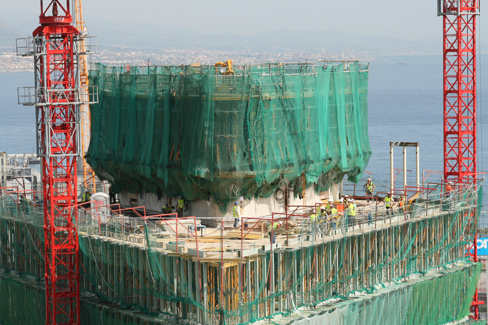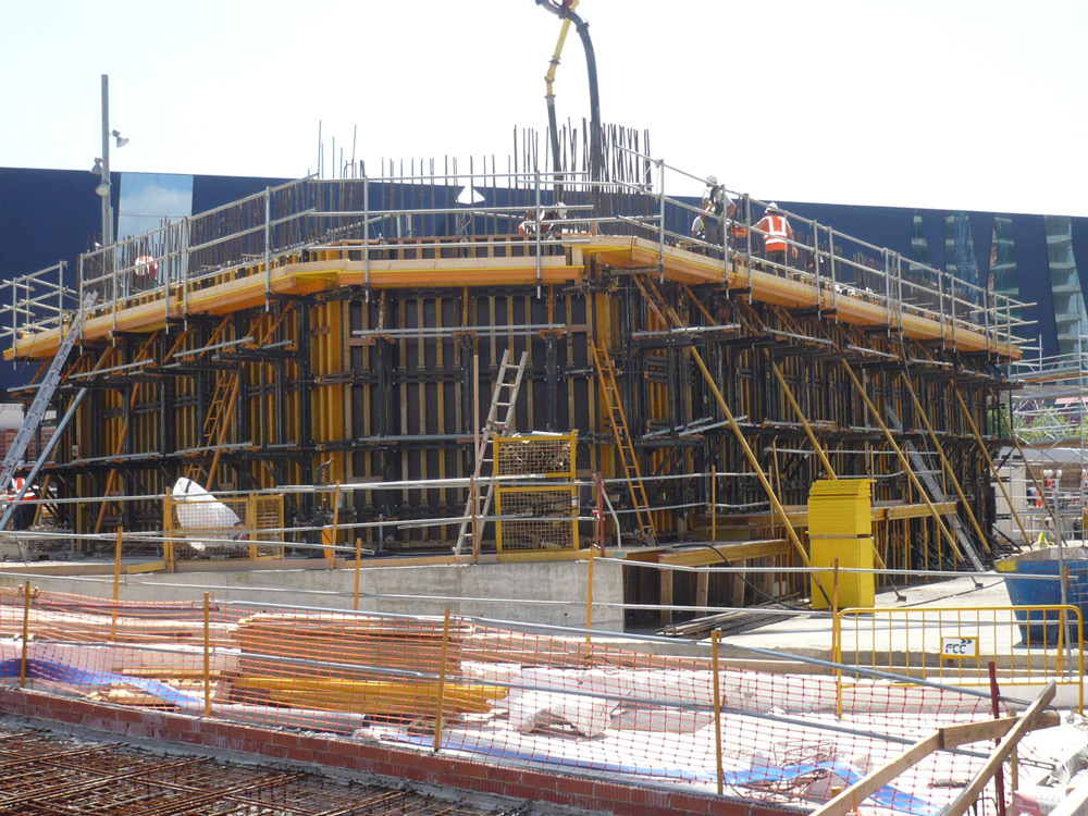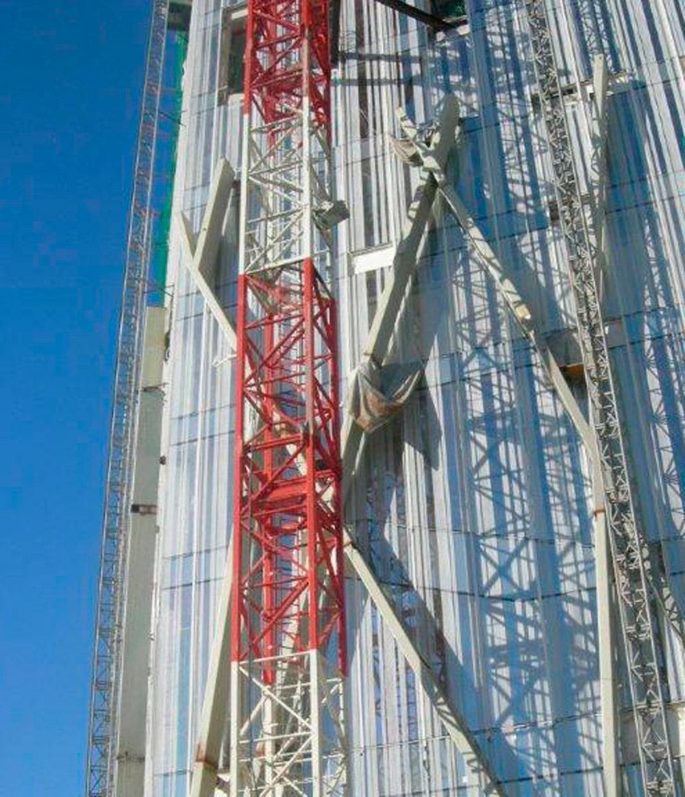 En el núcleo central se han ejecutado dos plantas por delante de las losas, mediante trepado con Consola 2000 y ENKOFORM V-100. Gran parte de las losas se construyeron con la cimbra horizontal RAPID y, en algún caso, con ENKOFLEX.