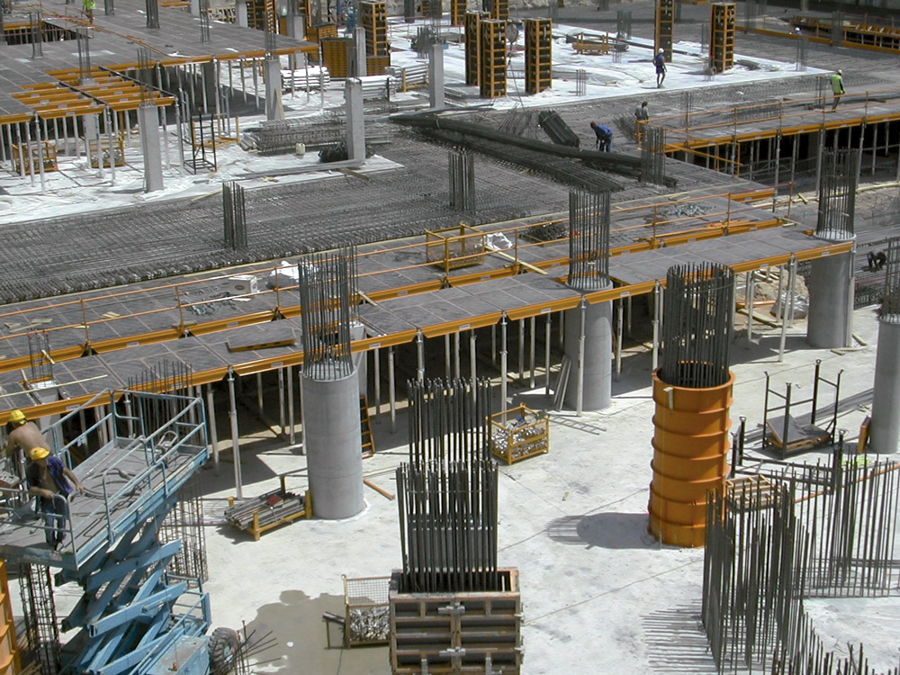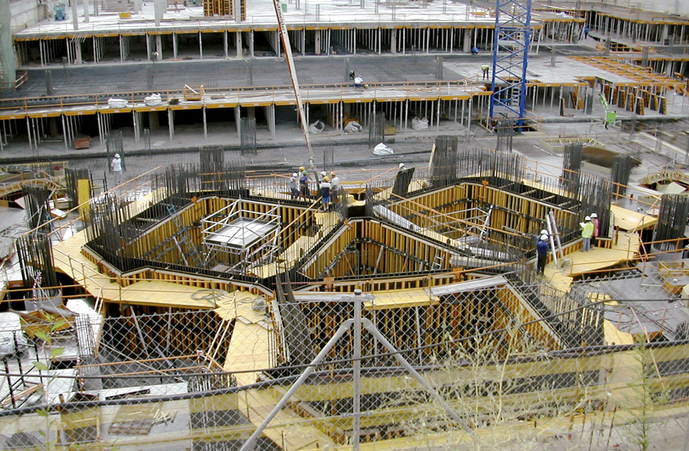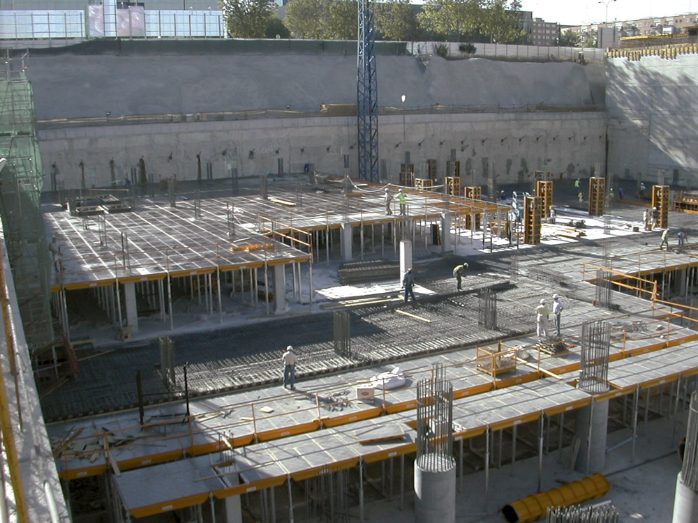 Las 6 plantas subterráneas y las 6 primeras desde rasante, se realizaron con la cimbra horizontal de aluminio CC-4, junto con el ALUPROP, con el que se consiguió grandes rendimientos en obra. Una de las ventajas más importantes que aporta CC-4, frente a otros productos del mercado, es la posibilidad de montar primero la retícula y después colocar los paneles.