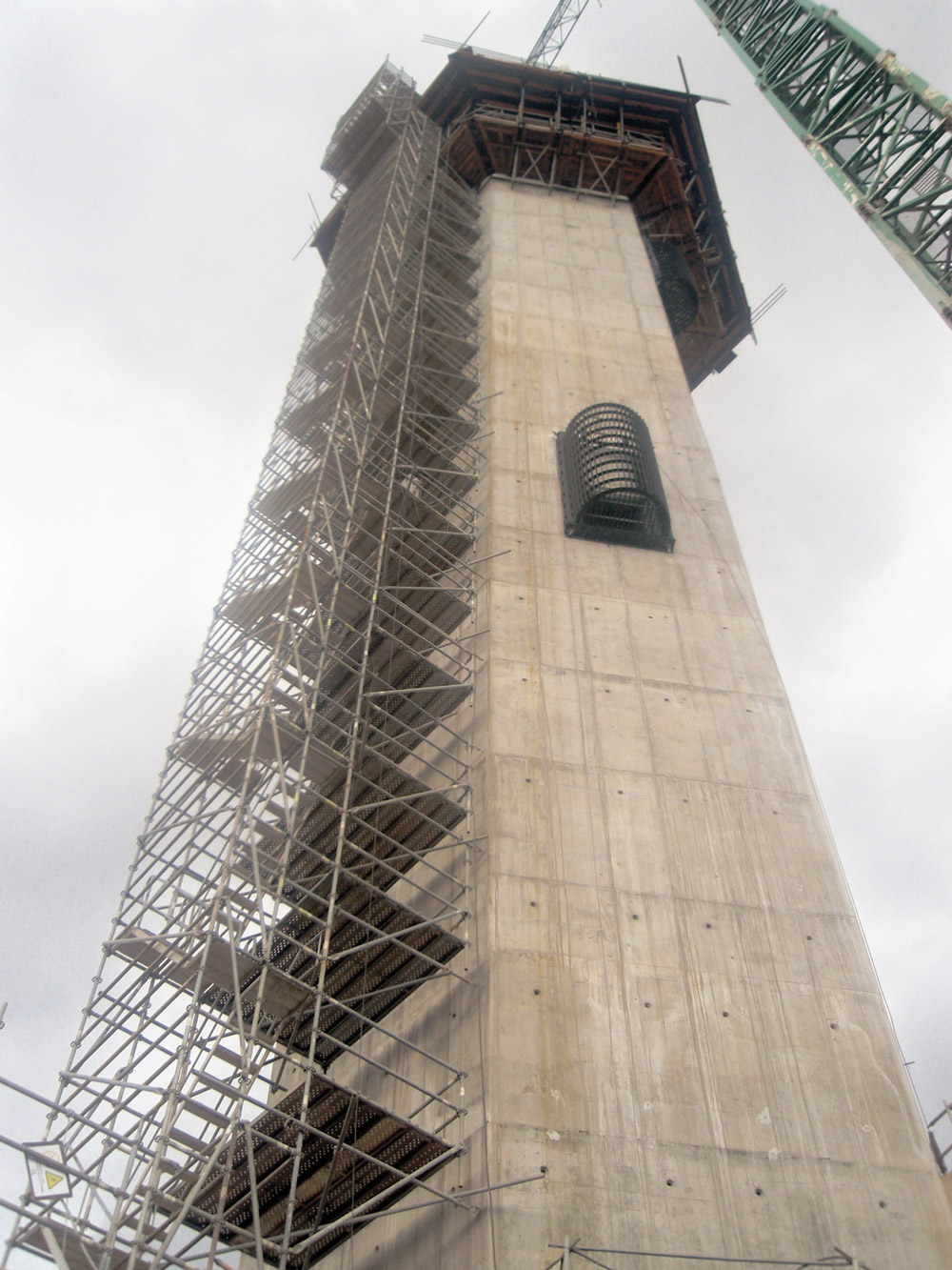 La torre de toma, que junto con la cámara de válvulas alcanza una altura de 90 metros, se ha ejecutado con trepados de 2 metros de altura mediante la Consola 2000 y el Cimbra de vigas de madera ENKOFORM V-100 en los muros rectos. Para los muros de la zona superior de la torre, que en sus últimos 10 metros de altura tiene una geometría cilíndrica de 13,5 metros de diámetro, se ha utilizado el Cimbra circular FLECTOR.