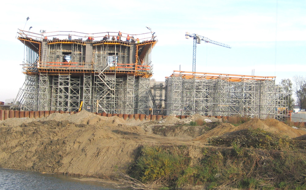 La cimbra de fondo del tablero se ejecutó con el Sistema MK cubierto con tablero contrachapado. MK soluciona este y muchos otros tipos de aplicaciones con el empleo de material estándar. Para la cimbra de alas se utilizó ENKOFORM H-120, cimbra de forma con vigas de madera.
