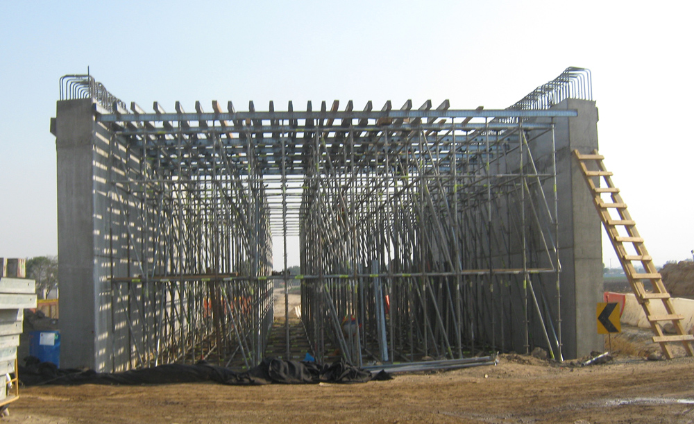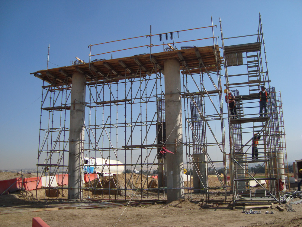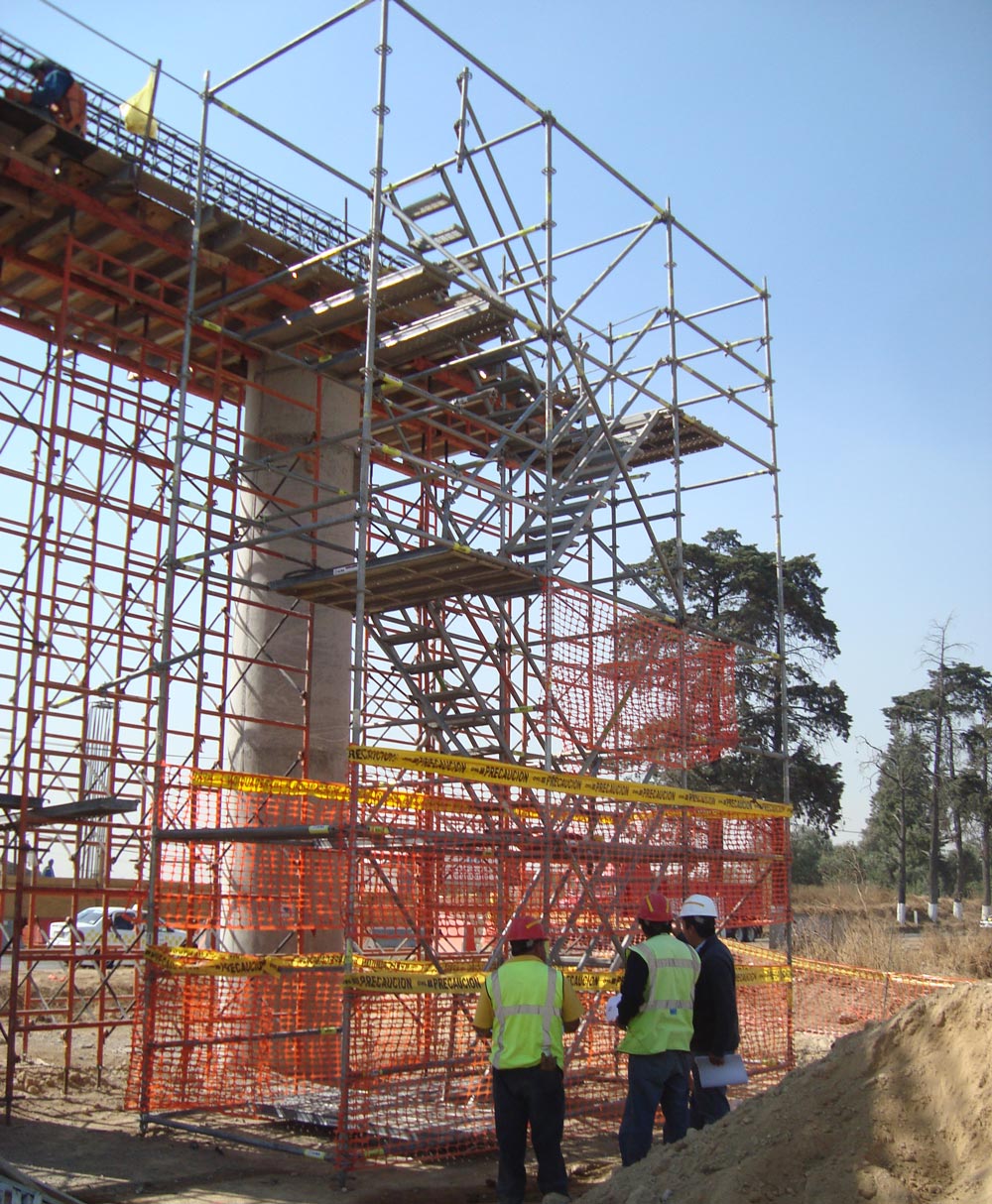 Cabezales para puentes. Se ha solucionado el apuntalamiento para los cabezales del entronque Los Reyes-Texcoco. Son cabezales de 30.00 m de longitud y 1.20 m de peralte a una altura de 6.00 m. Para el apuntalamiento se ha utilizado Multidireccional Brio y para el cimbrado de los cabezales, paneles NeVI de gama 1.20/0.90/0.75/0.60.