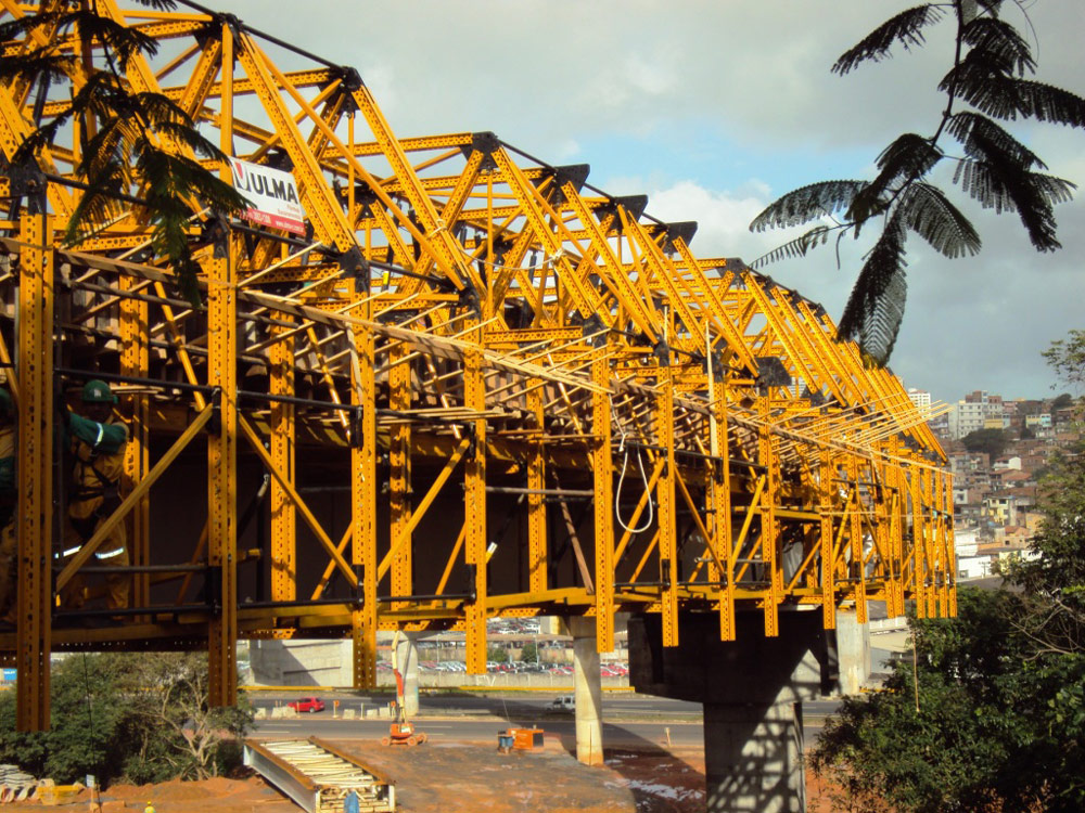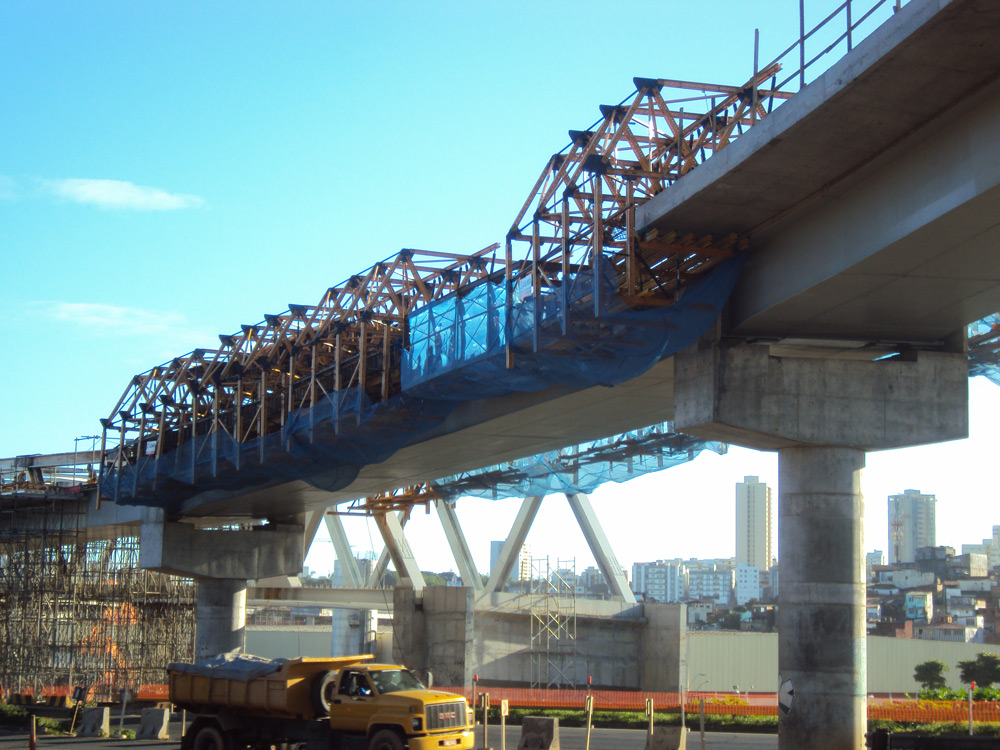 Este proyecto forma parte del Programa de Aceleración del Crecimiento (PAC) del Gobierno del Estado de Bahía. La carretera BR-324 une el Estado de Maranhão con el puerto de Salvador. Es una de las principales vías de este Estado e incluye varios pasos elevados. El viaducto 16, con 260 m de longitud y de tablero mixto de 10.5 m de ancho, discurre tanto por zonas pantanosas como sobre autopista, con vanos de hasta 40 m. Para sortearlos, se planteó una solución en voladizo que evita el uso de grúa y de apuntalamientos superiores a 20 m. Con ello, además de reducir el costo de mano de obra y agilizar el proceso de trabajo, se mantuvo la circulación de forma ininterrumpida.