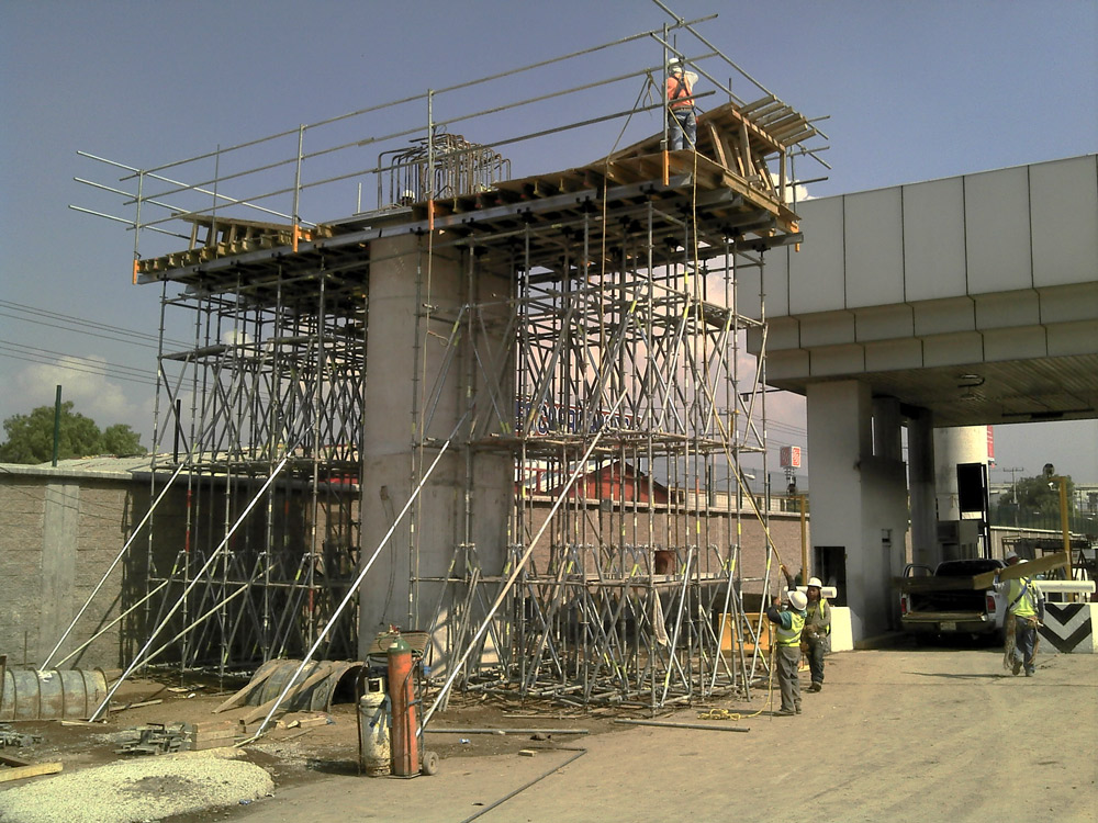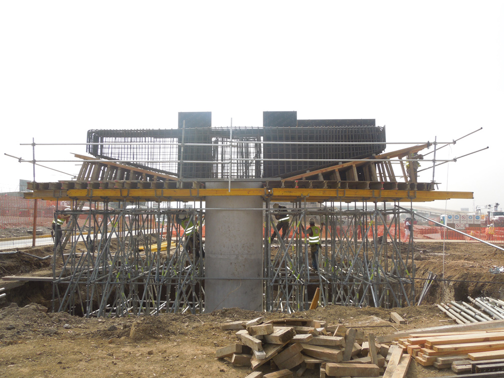 Existen dos tipologías de cabezales: Cabezales rectos 1.4 m de canto y cabezales con alas de 2.1 m. y largos aproximados de 10 m. de alturas variables. En ambos casos se soluciona colocando Cimbra BRIO a la altura necesaria y sobre ella una plataforma plana mediante ENKOFLEX formado por vigas BTM como primera tramada y vigas VM como segunda tramada. Las alas de los cabezales las soluciona la obra con polines o tablones de madera para hacer las inclinaciones.
