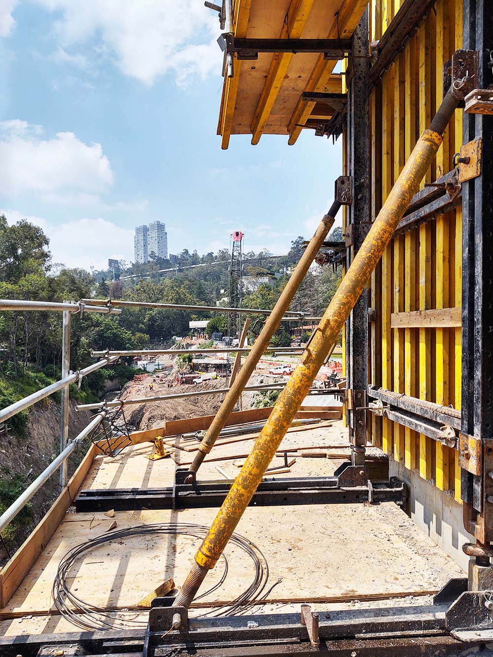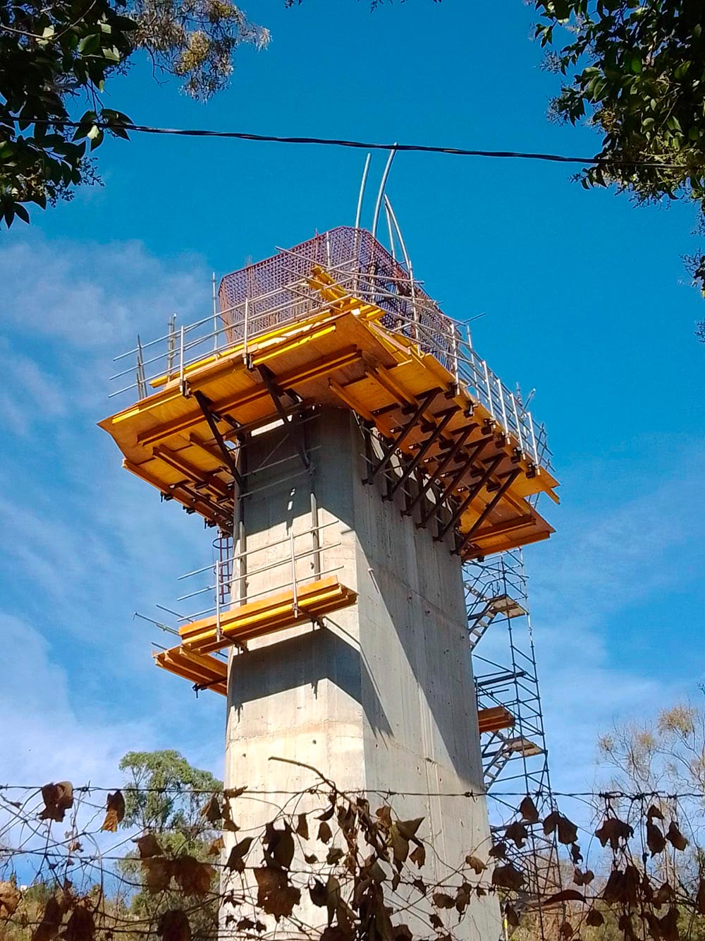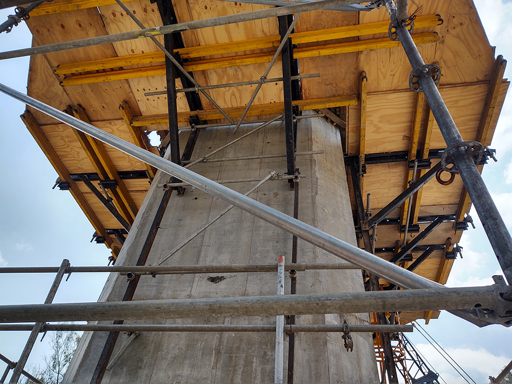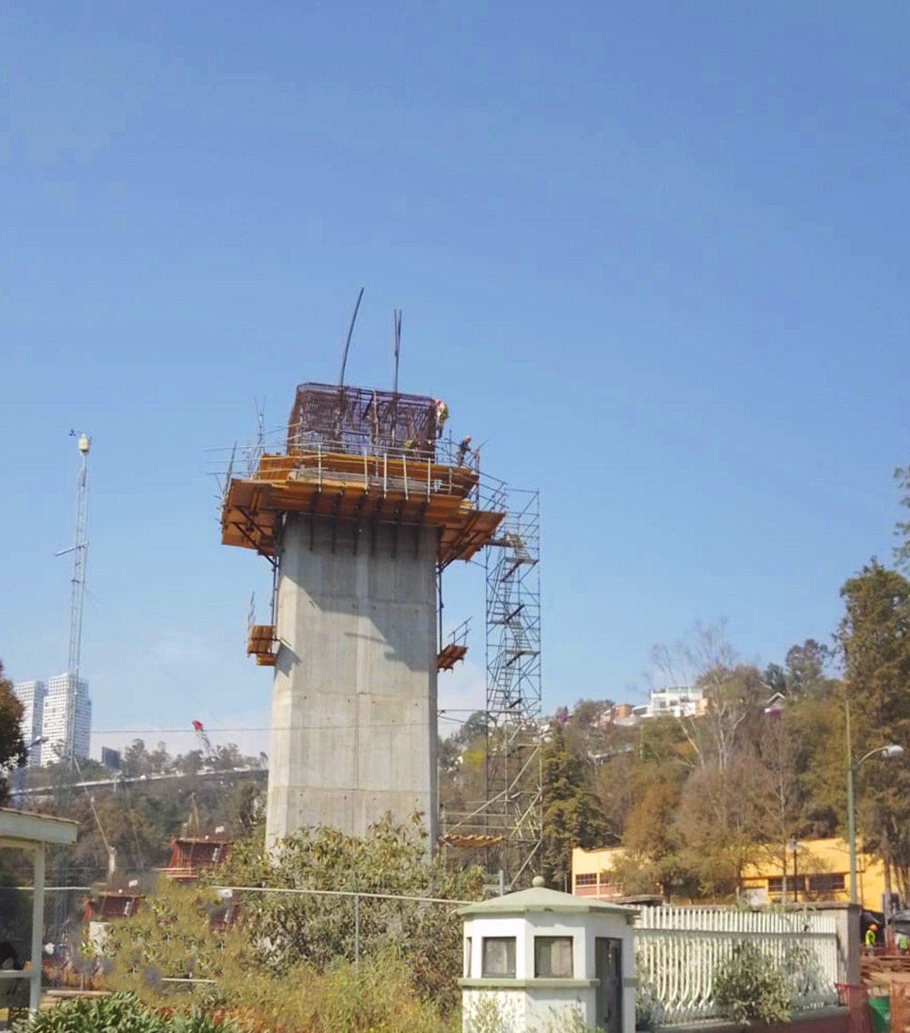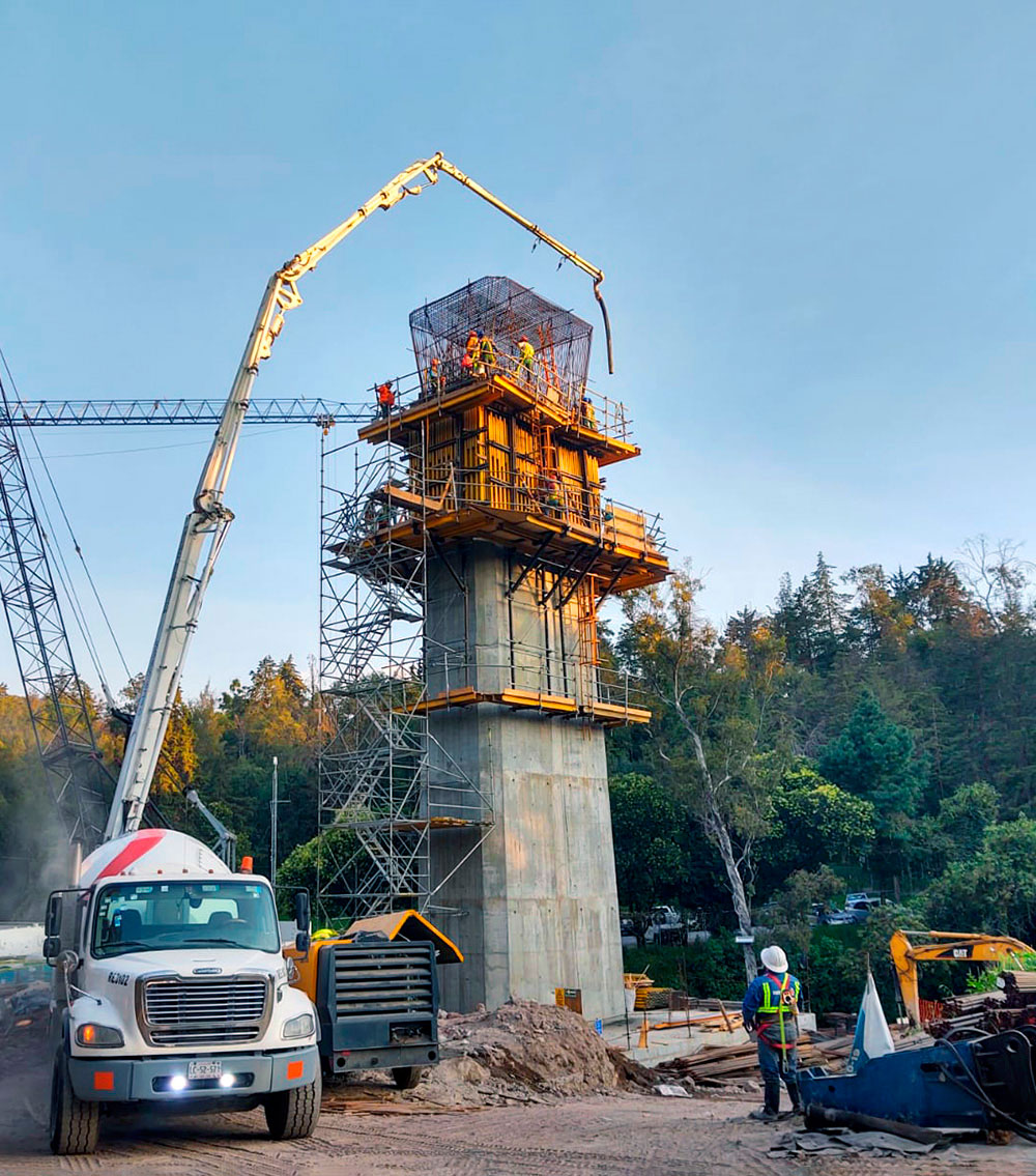 El panel ENKOFORM V-100 encofró las caras de la pila y el cabezal. Se ejecutaron 5 eventos de colado a 4.00m, más un evento de ajuste en altura para la pila y uno adicional para el cabezal, para finalmente se lograr una altura total de 24.66m. La sección es variable en las 4 caras de la pila, la base cuenta con dimensiones de 6.82x3.70m, mientras que en la parte superior las dimensiones son de 6.15x3.13m bajo estas consideraciones la solución incluyó la realización de paños modulares ENKOFORM V-100 más la aplicación de postizos para la adaptación de la geometría en altura. Para los consecutivos montajes en de los paños y la ejecución de los 6 eventos de colado de la pila, se diseñó una Consola de trepado CR-250, la cual necesitó adaptabilidad ya que, en los primeros eventos, las caras de la pila donde se ancló la estructura contaron con mayor dimensión que el evento 5, y para la solución del cabezal usando este mismo equipo, se hizo una adaptación más.